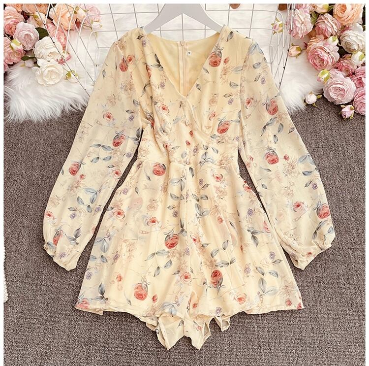 2021年春夏Vネックパフスリーブ長袖ジャンプスーツファッションスリムワイドレッグパンツルーズジャンプスーツ ロング スプリング 春物 サマー 夏物 ワイドパンツ