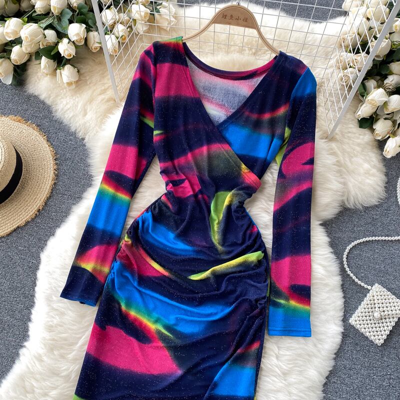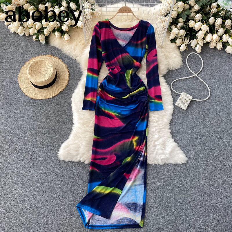 女性プリントマキシドレス長袖Vネックスリムドレス秋のセクシーなスプリットストリートウェアロングドレス オータム 秋物