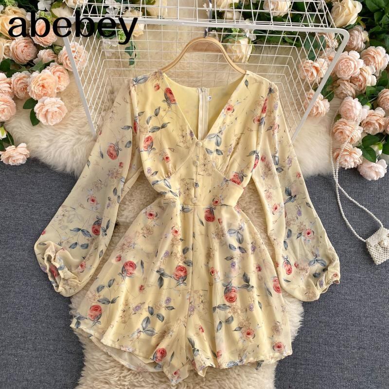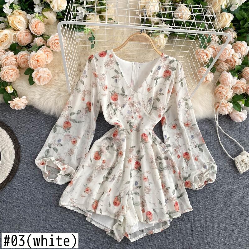 フレンチプリントジャンプスーツレディーススウィートVネックパフスリーブロンパース秋のボヘミアンプリントワイドレッグショートロンパース 大人ガーリー キュート カジュアル オータム 秋物 ワイドパンツ