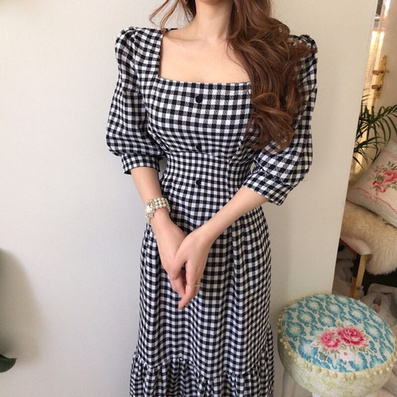 スタイルウエストレッドチェック柄ヴィンテージマーメイドドレス女性パフスリーブミディホリデー服 ビンテージ