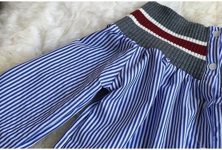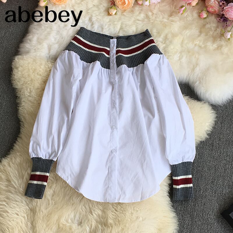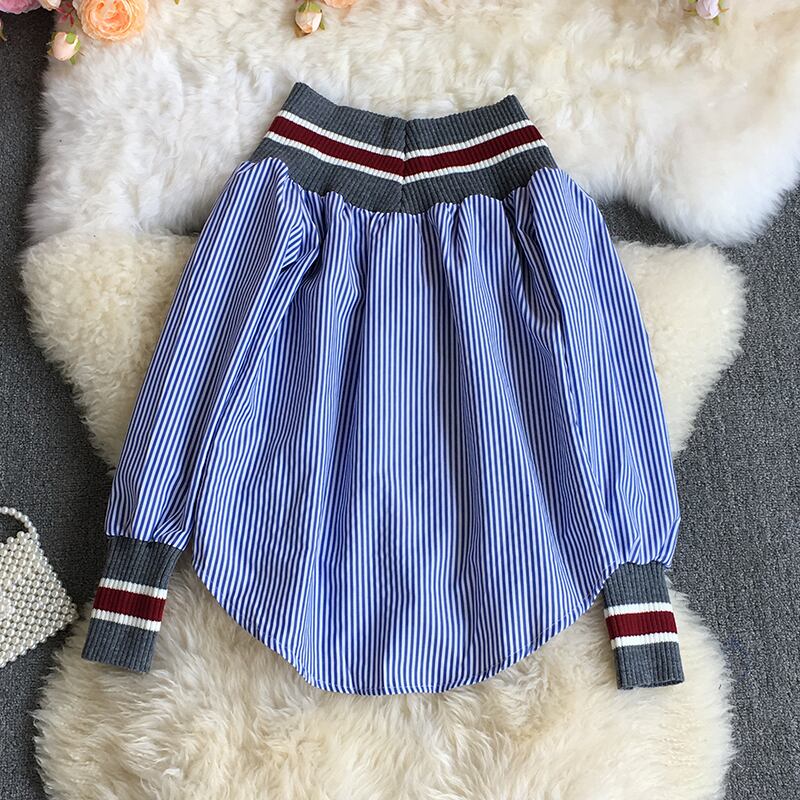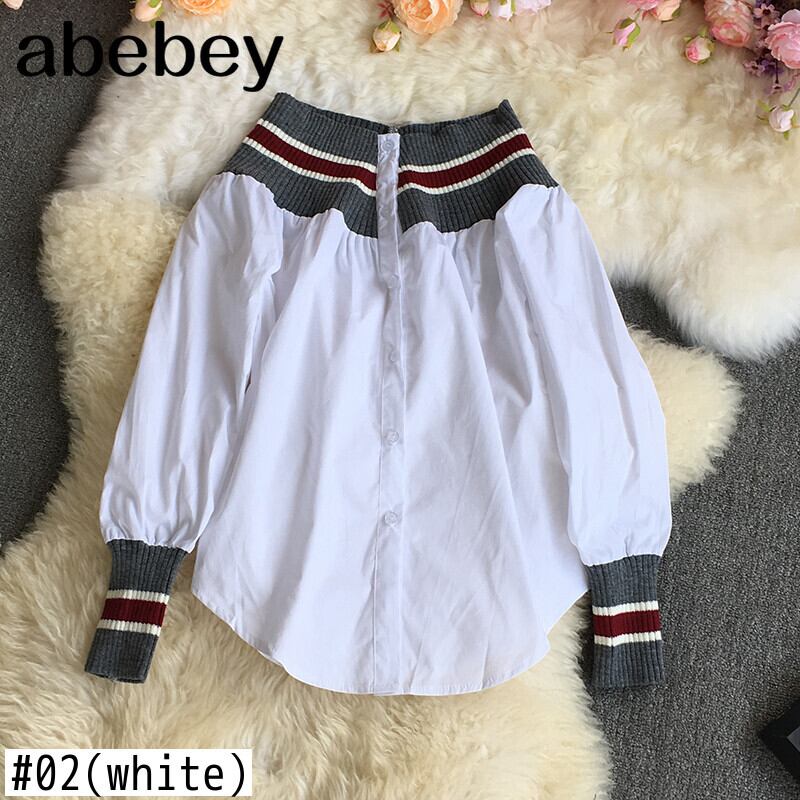 2021年春秋スラッシュネックランタンスリーブシャツオフショルダーデザインストライププリントシングルブレストシャツトップ スプリング 春物 オータム 秋物