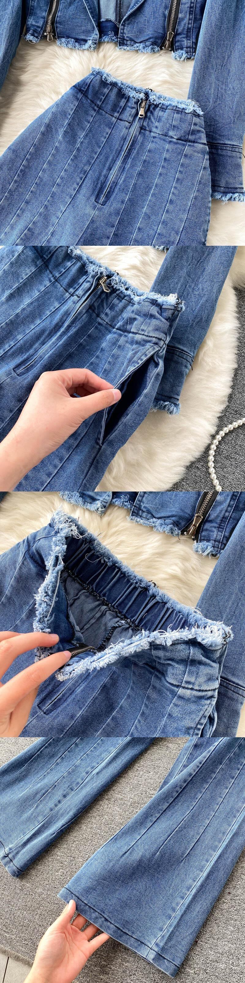 女性秋冬レトロデニムセットジッパー長袖ショートアウター+ウエストワイドレッグロングパンツツーピーススーツ オータム 秋物 ウィンター 冬物 ワイドパンツ