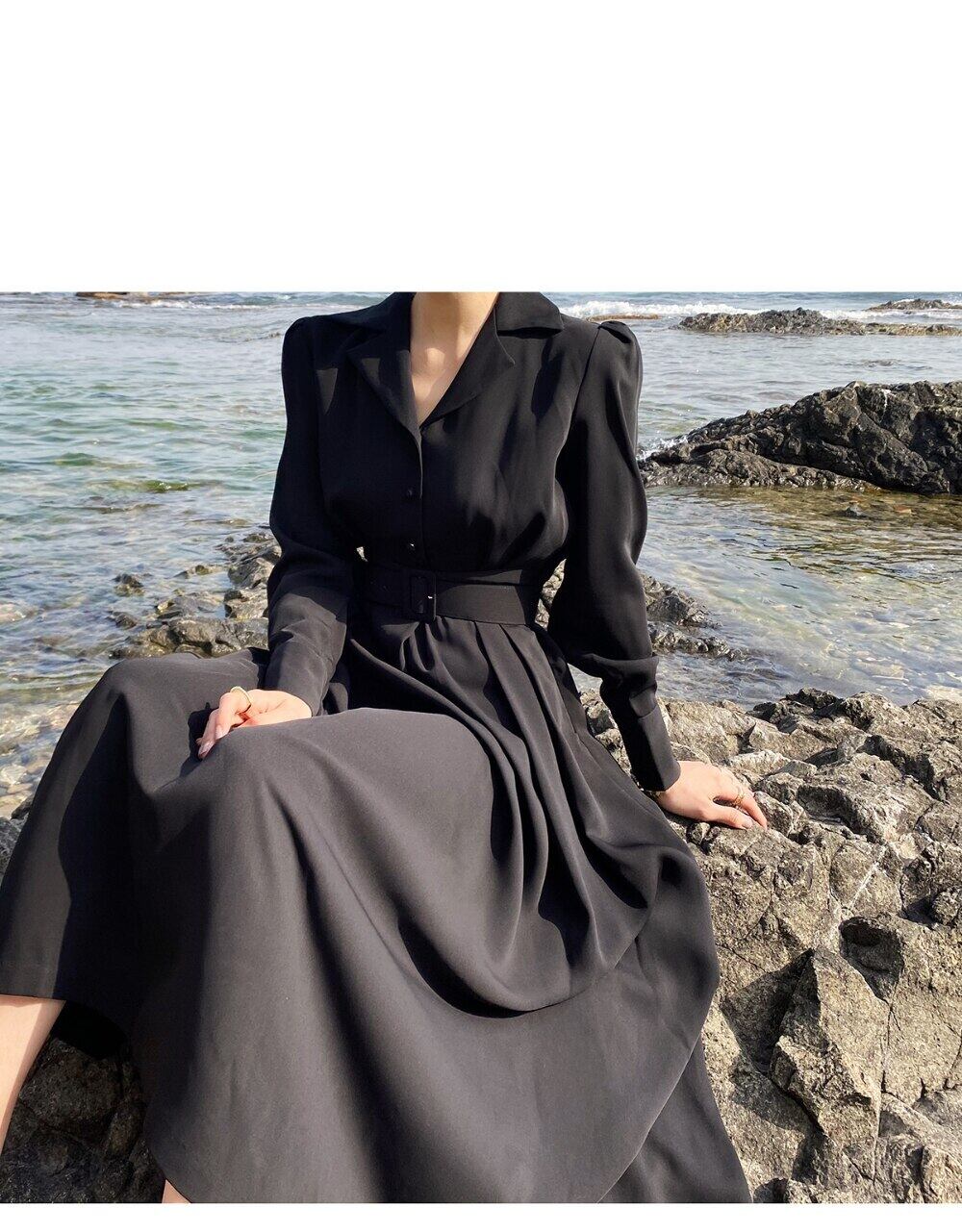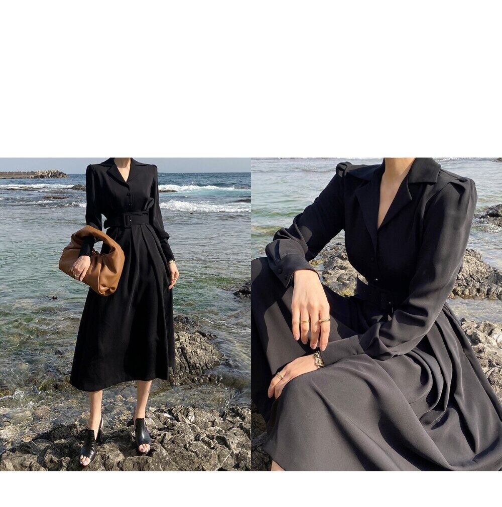 女性の2021年秋ノッチ付き無地長袖シングルブレストミッドカーフドレスベルト付き ロング オータム 秋物 ハーネス ソリッドカラー