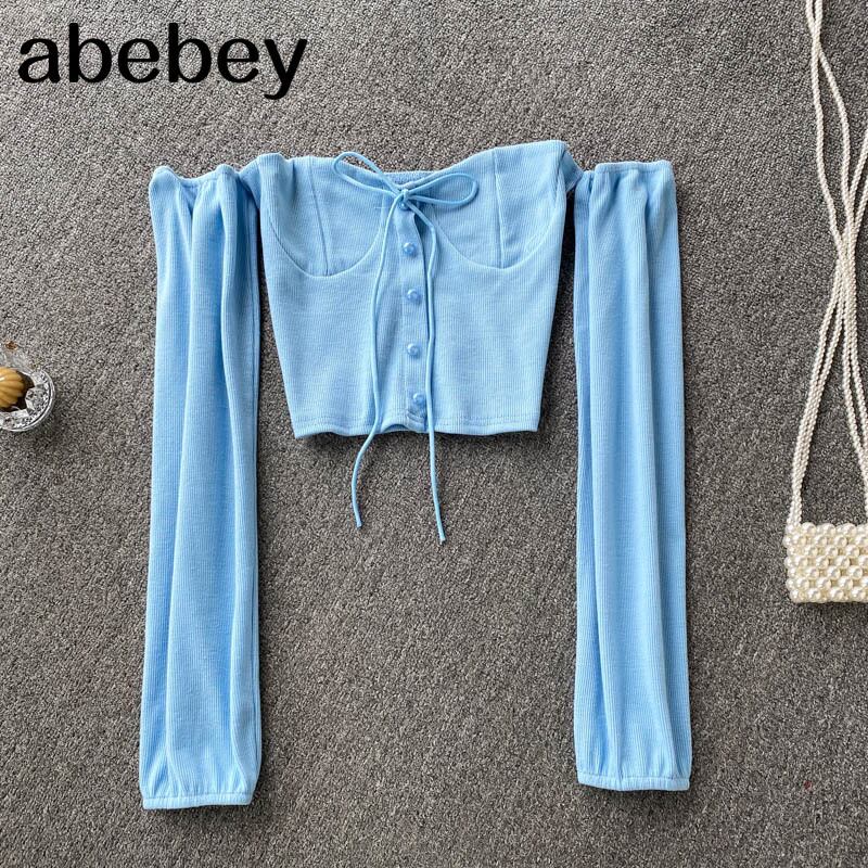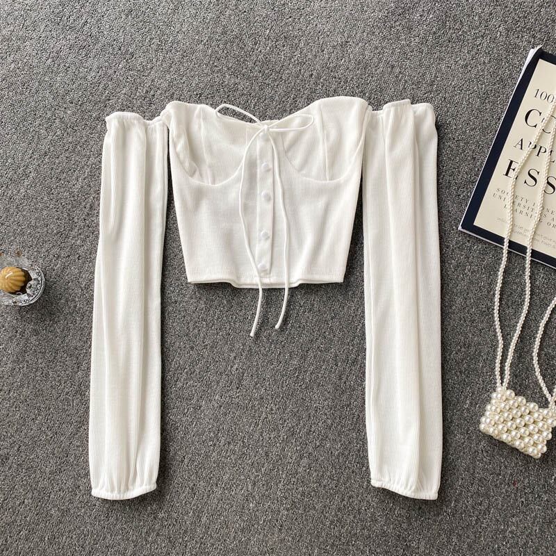 女性ニットブラウスセクシースラッシュネック長袖スリムトップス2021秋オフショルダーストリートウェアショートブラウス ロング オータム 秋物