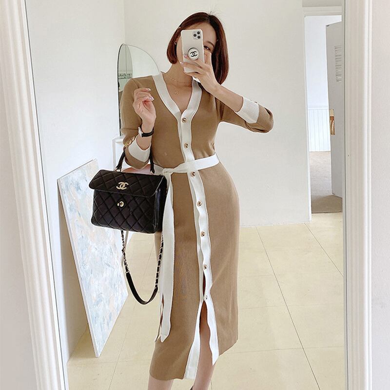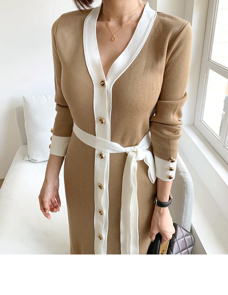 女性秋のシックなパッチワークVネックニットドレス甘い長袖スリムフィットミディローブVestidosドレスベルト付き ロング 大人ガーリー スウィート キュート カジュアル オータム 秋物 ハーネス