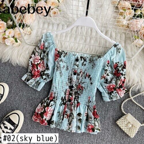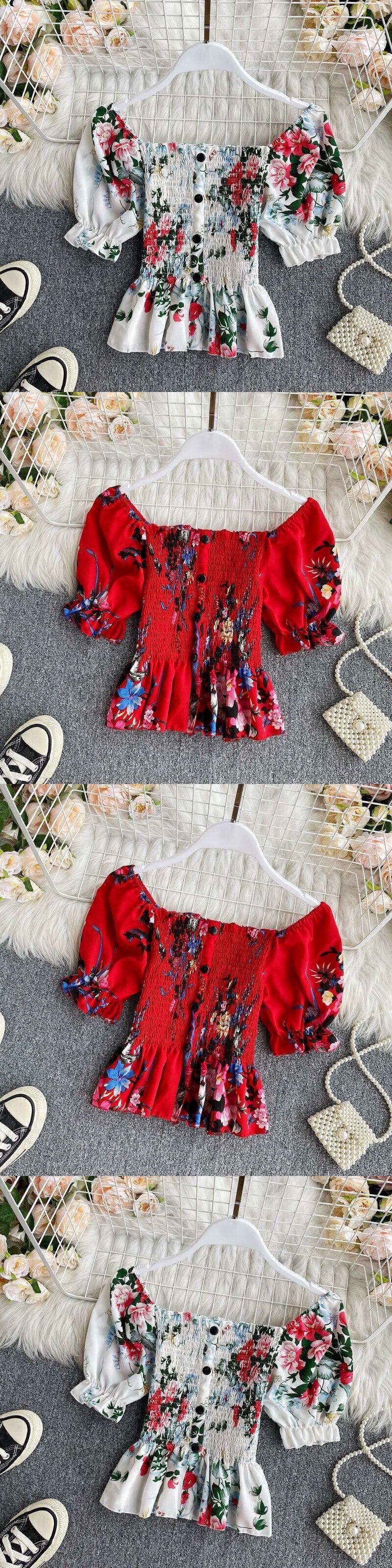 シフォンフローラルレディースブラウスパフ半袖スクエアカラー2021サマーストレッチスリムフリルシャツ ショート ハーフスリーブ 夏物 花柄 スクウェア