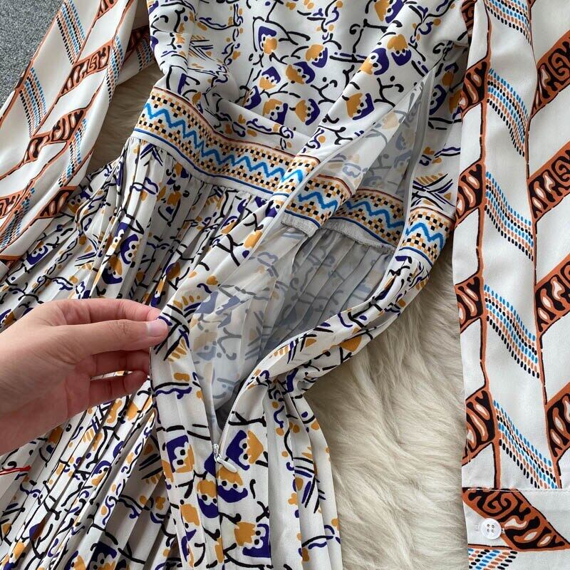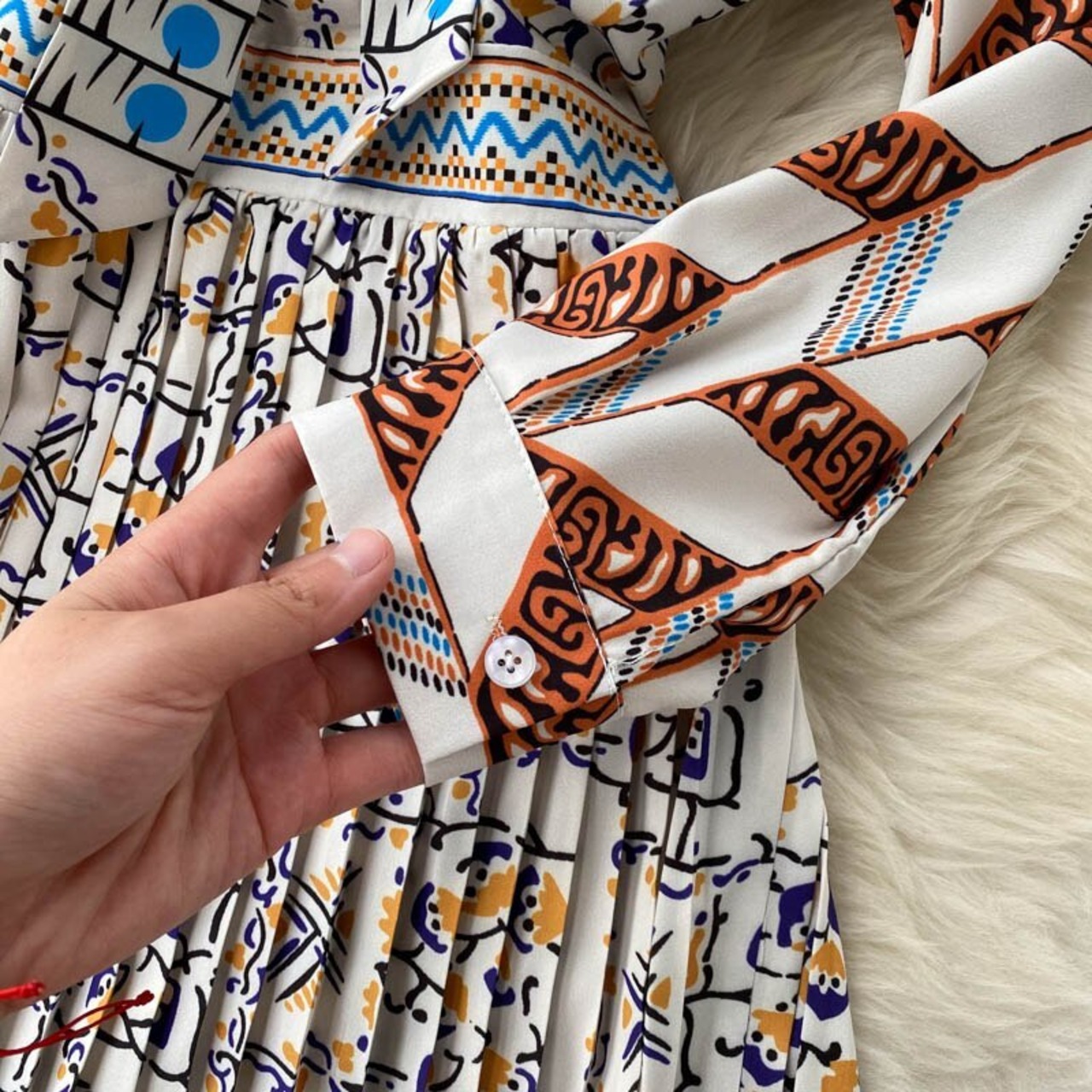 女性フレンチプリントプリーツドレスボウカラー長袖Aラインドレス2021秋のストリートウェアロングドレス リボン オータム 秋物