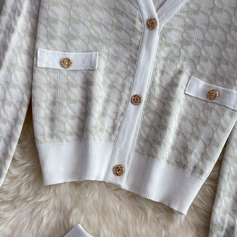 女性秋冬ニットセット長袖シングルブレストカーディガン+ウエストスリムショートスカートツーピーススーツ ロング オータム 秋物 ウィンター 冬物