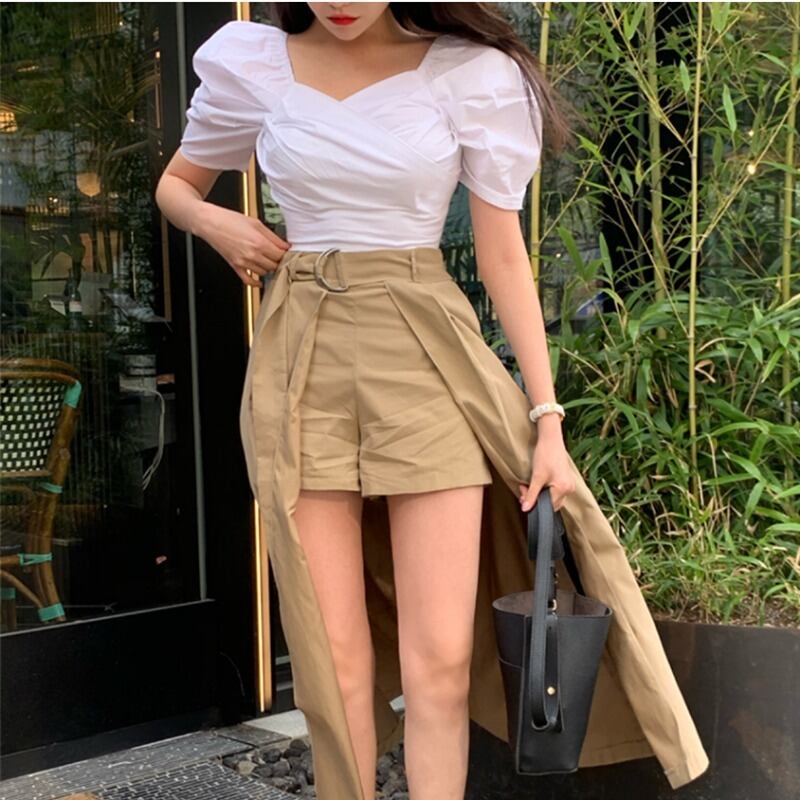 サマーパフスリーブレディースホワイトブラウス+ウエストスプリットロングスカートツーピースセットスーツ 夏物