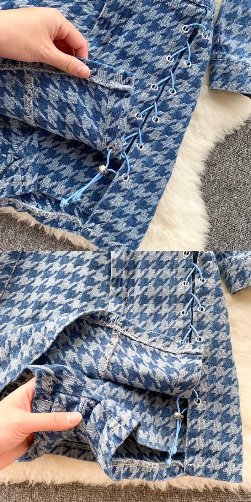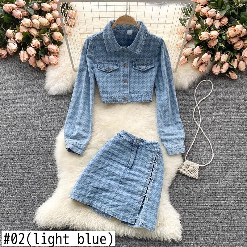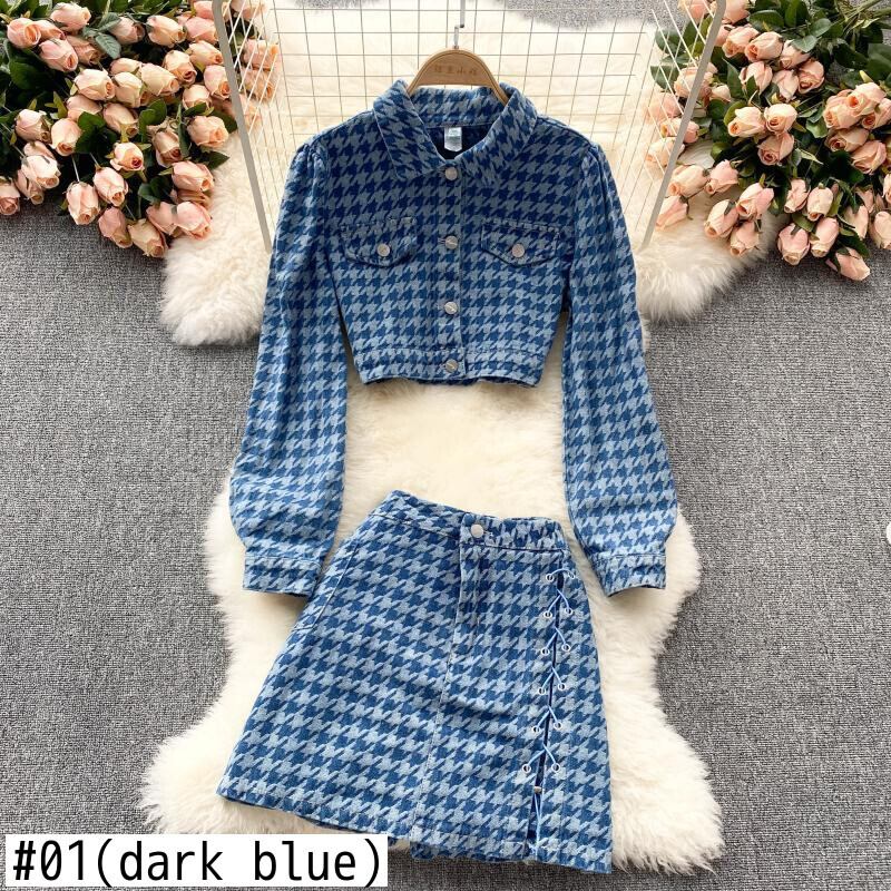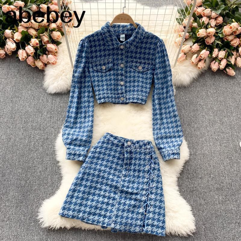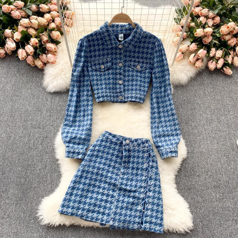 女性秋レトロ千鳥格子デニムセットターンダウン-襟長袖ショートアウター+ Aラインショートスカートツーピースセット ロング オータム 秋物