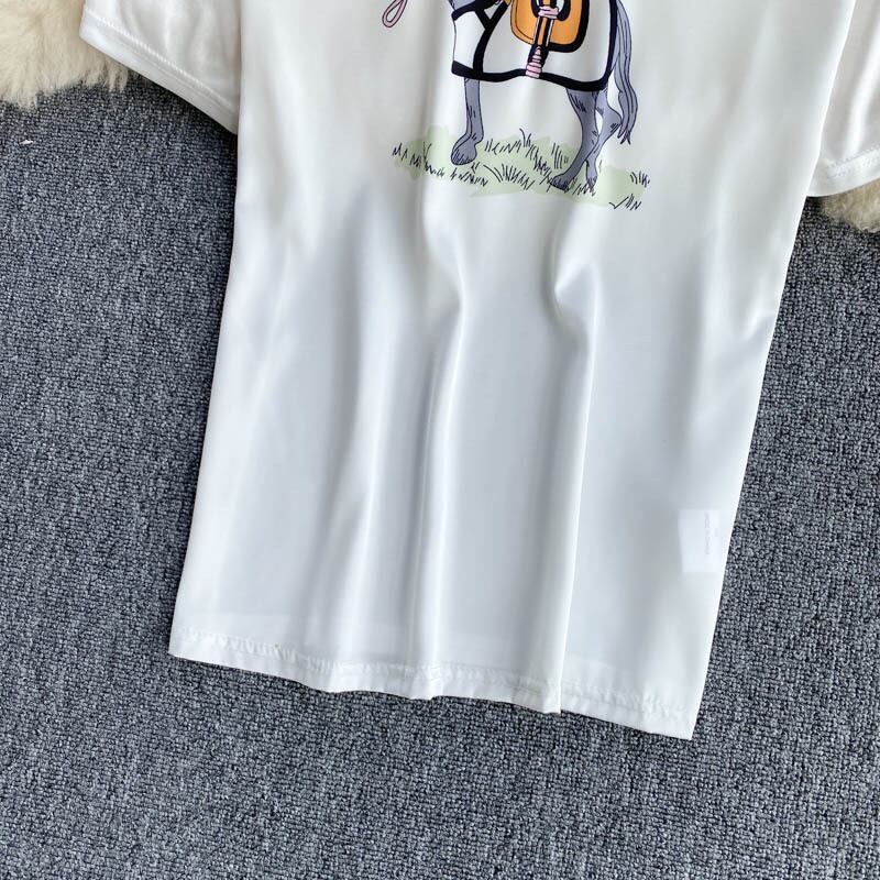 女性2021年サマーホースプリントセット半袖OネックホワイトTシャツ+ウエストミディスカートツーピーススーツ ショート ハーフスリーブ 夏物