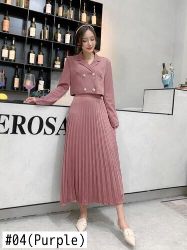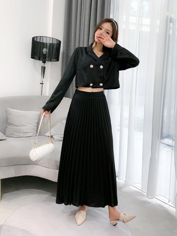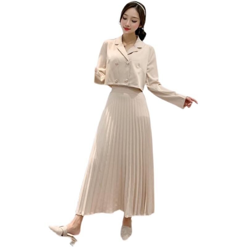2021年夏のターンダウンカラー長袖ダブルブレストトップ+ハイウエストAラインプリーツロングスカート2点セット ハイウェスト サマー 夏物