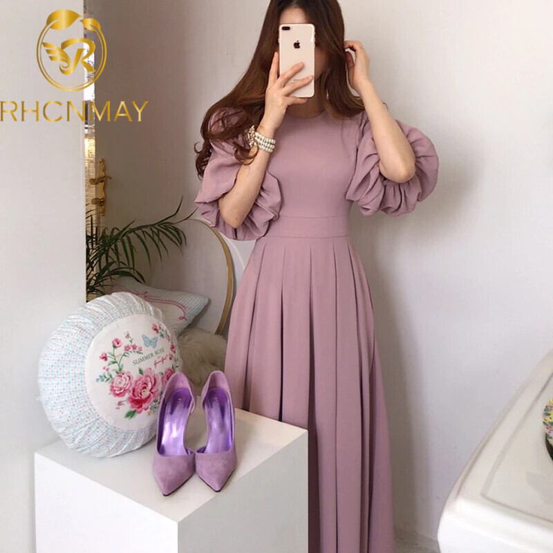 ソリッドシックな女性のドレス ラウンドネックウエストストラップランタンスリーブプリーツロングドレス サマー 夏物 Oネック ソリッドカラー