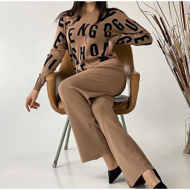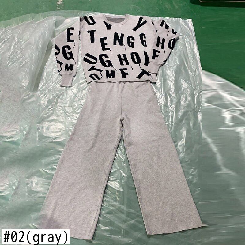 レタープリントニットツーピースセットレディースコットンプルオーバーワイドレッグパンツスーツ2021秋カジュアルオフィスレディセット オータム 秋物 ワイドパンツ 会社 学校 通勤や通学にも