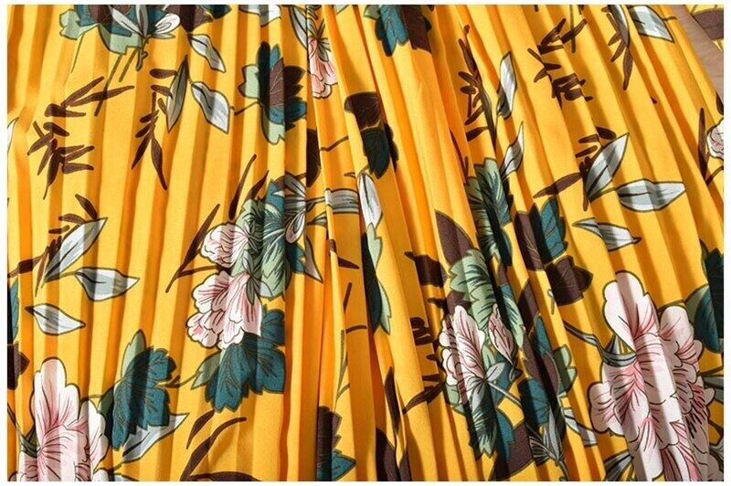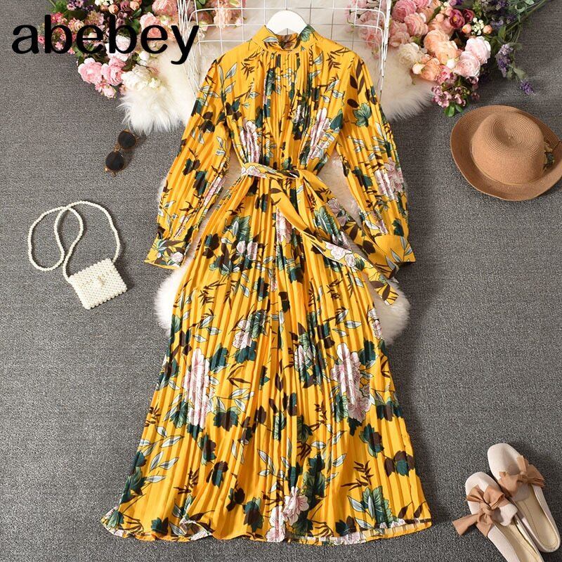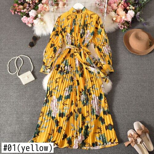 春の女性のドレスフォークポリエステル長袖レースアッププリーツドレス美容花プリントミッドカーフスイングロングドレス スプリング 春物 フラワーデザイン