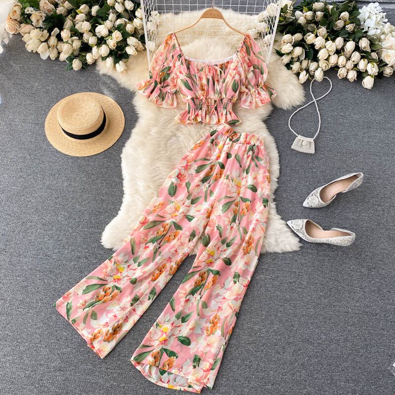 女性サマー自由奔放に生きるプリントホリデーセット半袖スクエアカラーショートトップ+ウエストワイドレッグロングパンツツーピーススーツ ハーフスリーブ 夏物 ワイドパンツ スクウェア