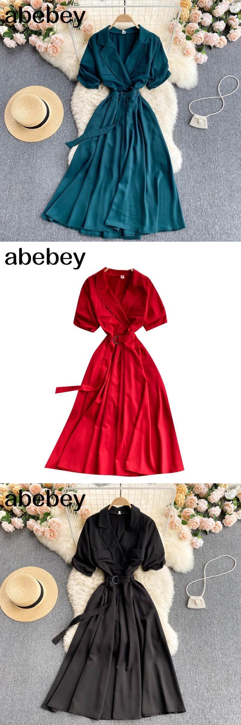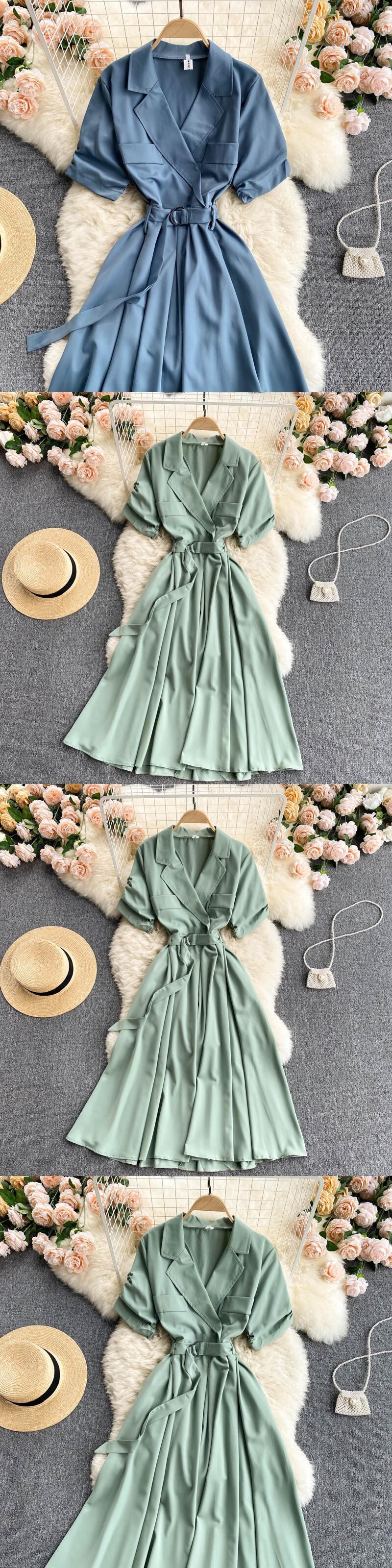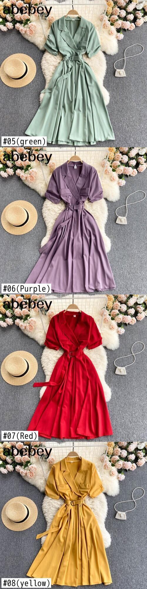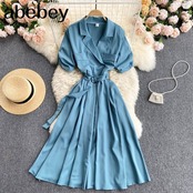 女性プリーツドレスソリッドサッシュオフィスドレスサマーストリートウェアAラインミディドレス 夏物 ソリッドカラー 会社 学校 通勤や通学にも
