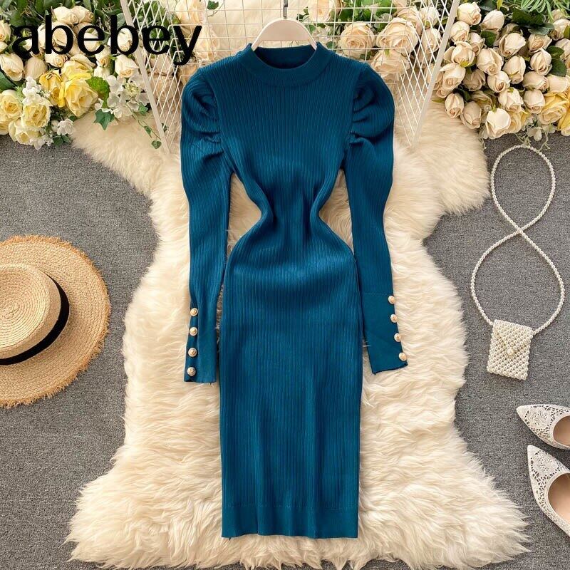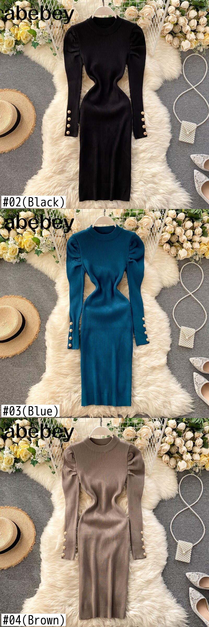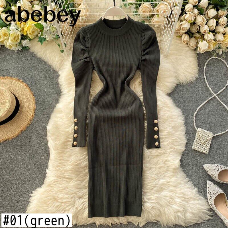 パフスリーブ レディース セーター ドレス 秋冬スリムストレッチボディコンニットドレスオフィスドレス オータム 秋物 ウィンター 冬物 会社 学校 通勤や通学にも