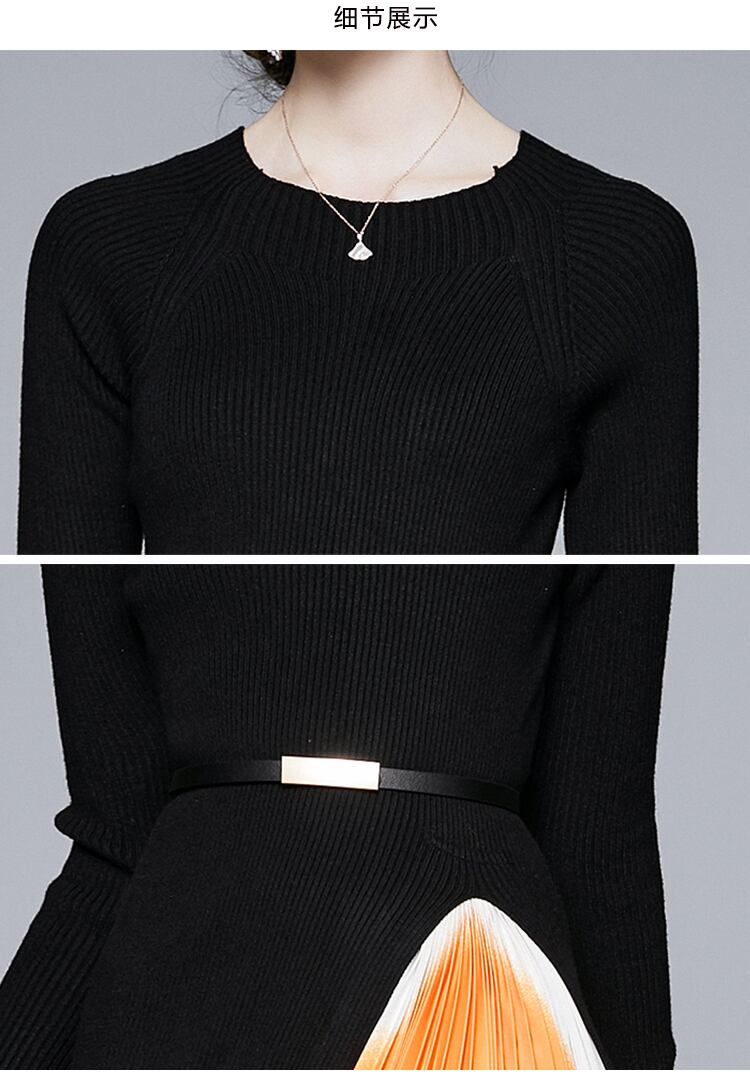 キャットウォークレトロニット長袖ルーズスプライシンググラデーションプリーツスカート丈ワンピース 春秋女性 ロング スプリング 春物
