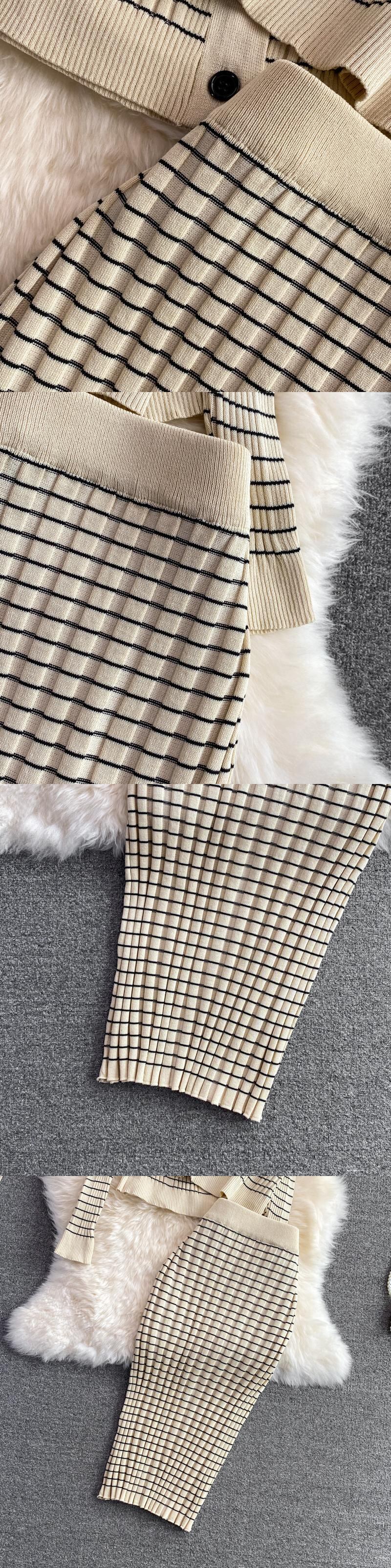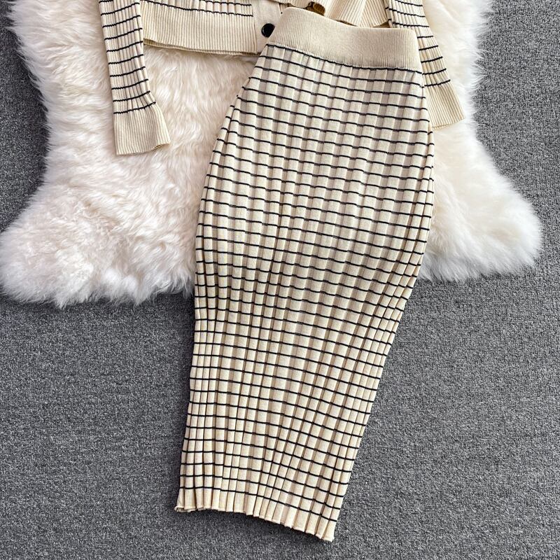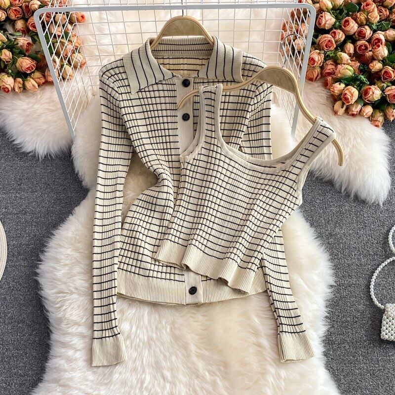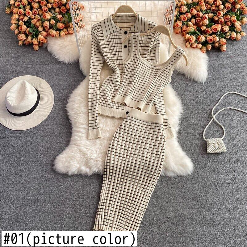 女性3点セット2021秋スタイル気質スーツチェック柄ニットカーディガンボトムキャミソールスカート オータム 秋物