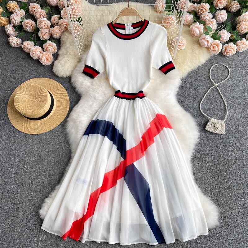 女性ドレススプライスニット半袖OネックAラインドレス2021夏休みミディサンドレス ショート ハーフスリーブ サマー 夏物