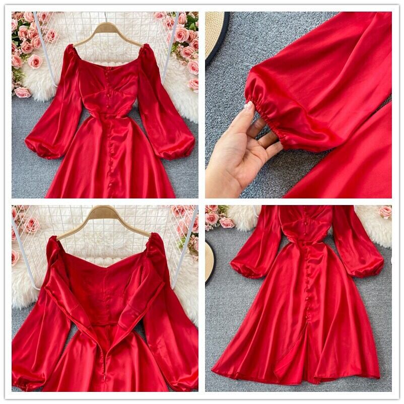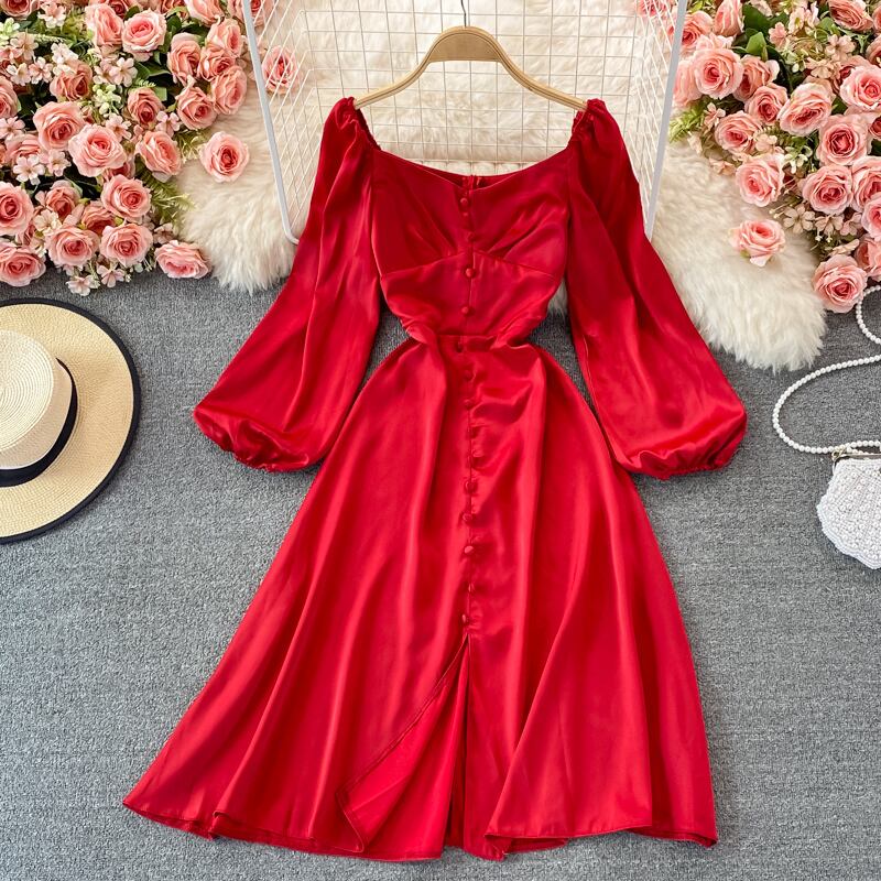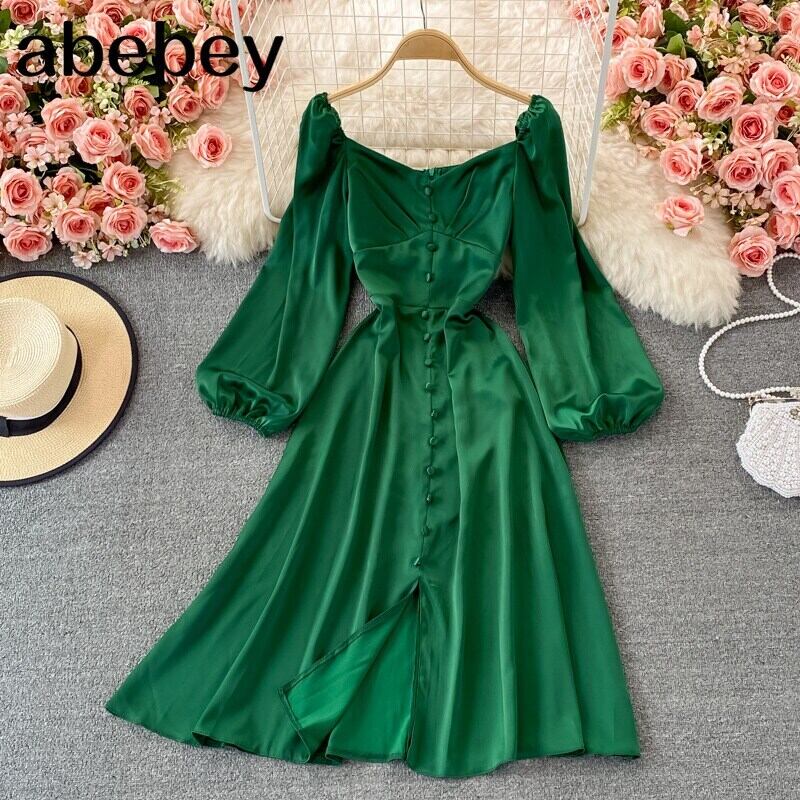女性フレンチドレスレトロパフスリーブVネックAラインドレス秋のセクシーなスプリットストリートウェアミディドレス オータム 秋物