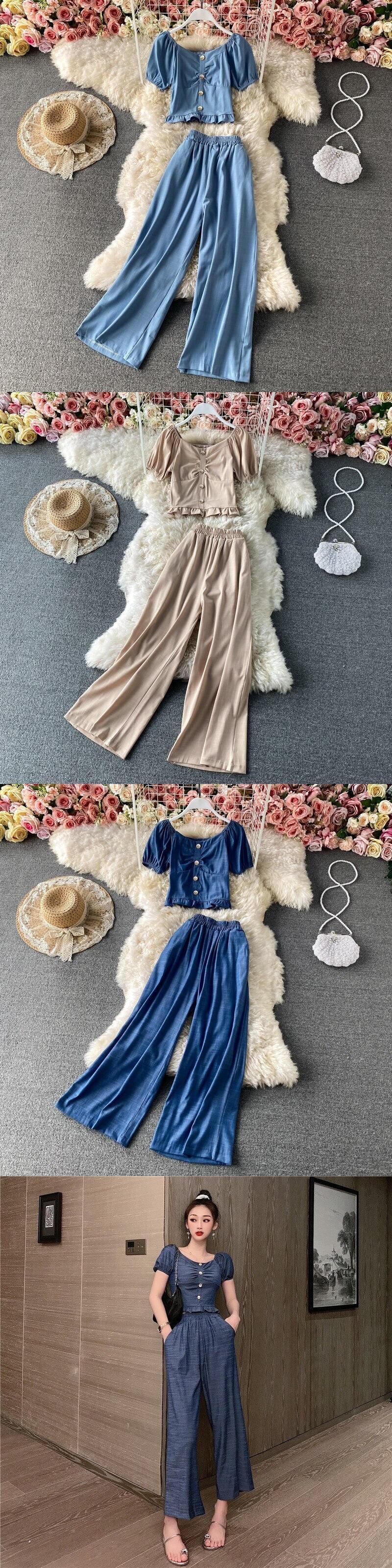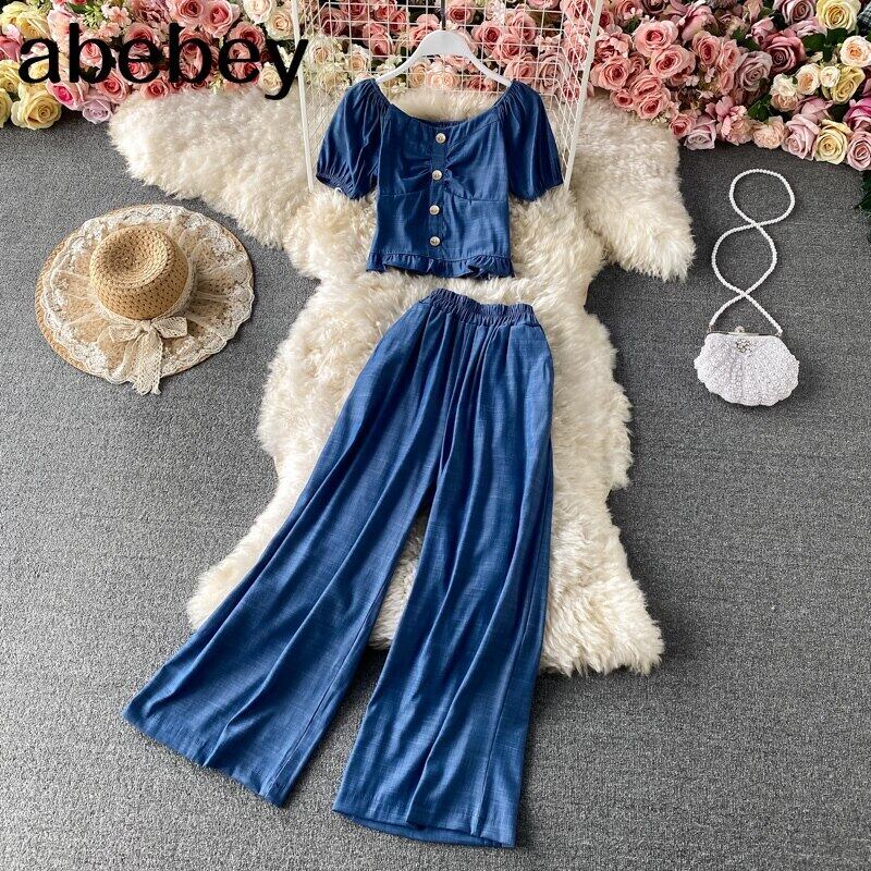 ブルーパフスリーブ伸縮性クロップドトップスとワイドレッグパンツ2ピースパンツセット女性イミテーションカウボーイセット エラスティック ワイドパンツ