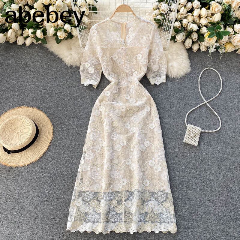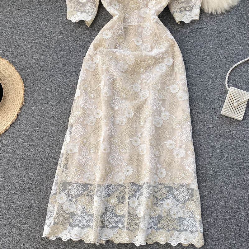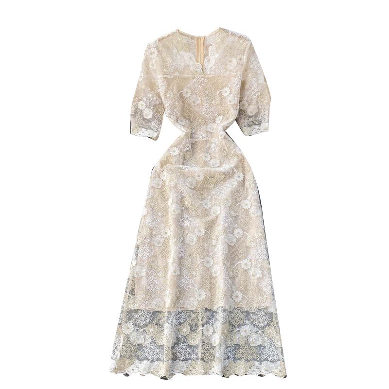女性の刺繡レースドレスフレンチパフスリーブVネックAラインドレス2021夏のストリートウェアミディドレス 刺繍 サマー 夏物