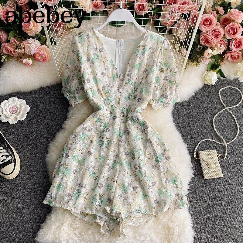 フランス人女性シフォンプレイスーツフローラルプリント刺繡サマービーチロンパースVネックボイルノーブルオーバーオールジャンプスーツ 刺繍 夏物 花柄