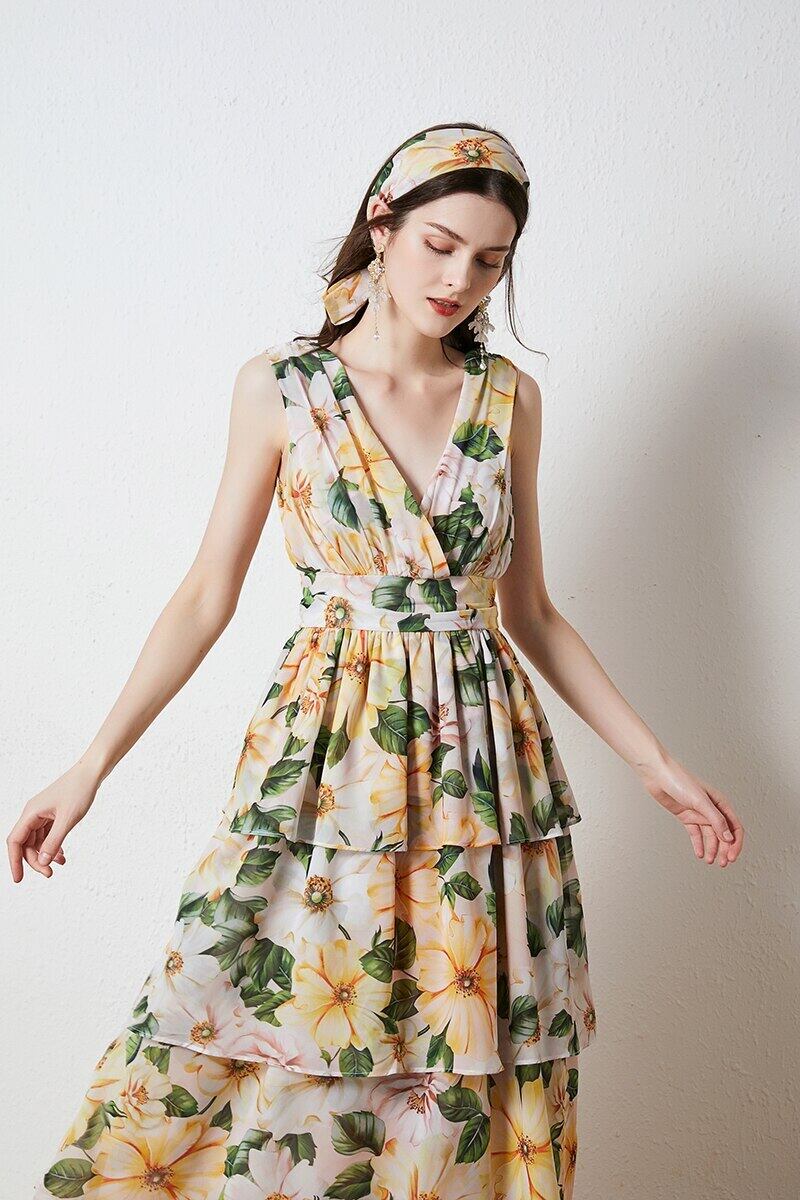 2021年夏の滑走路Vネックロングドレスレディースノースリーブイエローカメリアプリントカスケードフリルホリデードレス サマー 夏物