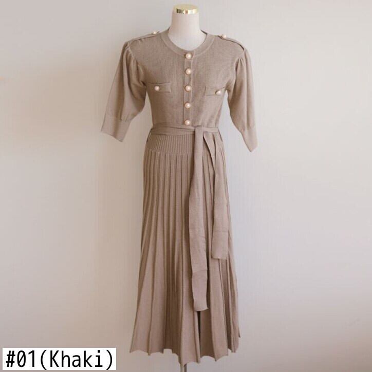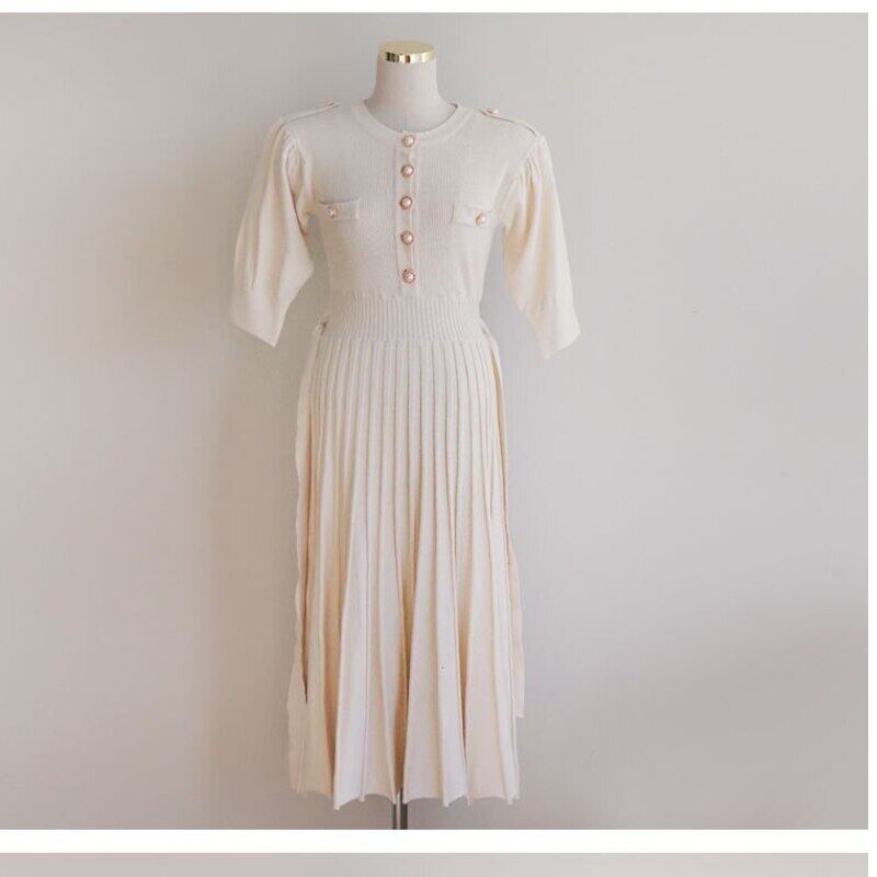 2021年夏ニットヴィンテージ女性ロングドレスハーフスリーブシングルブレストベルトプリーツドレスVestidos 半袖 サマー 夏物 ハーネス ビンテージ