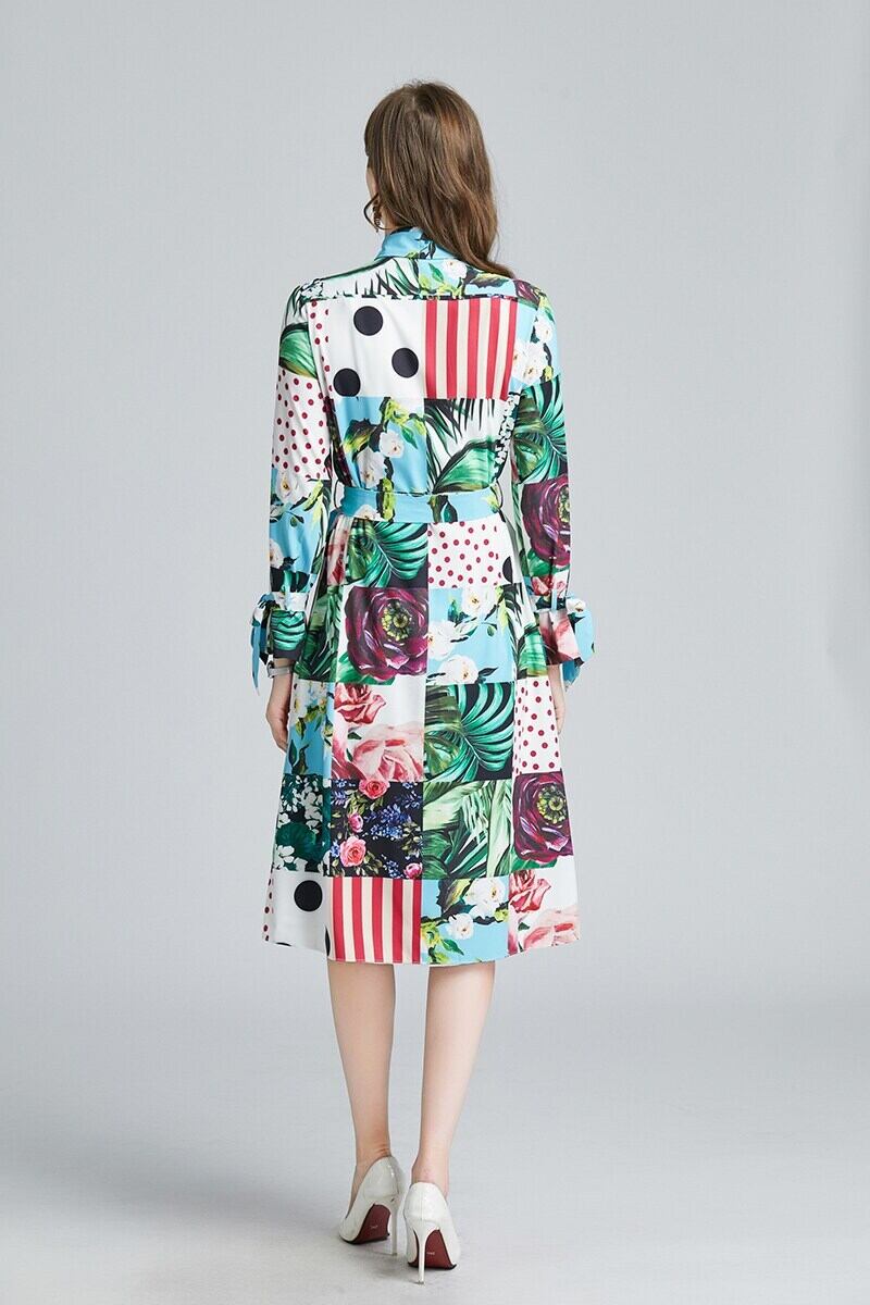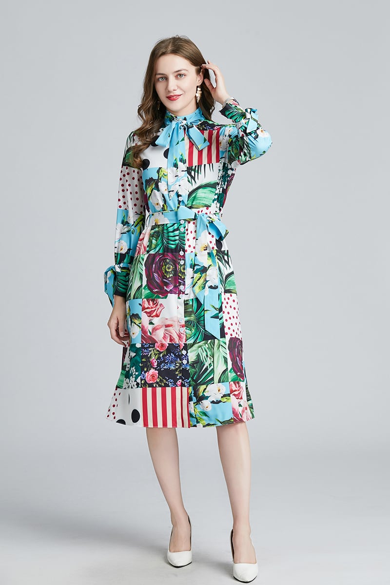 2021年春の滑走路コントラストフローラルシャツドレス女性長袖蝶結びマルチカラープリントサッシュホリデーミディドレス ロング リボン スプリング 春物 花柄