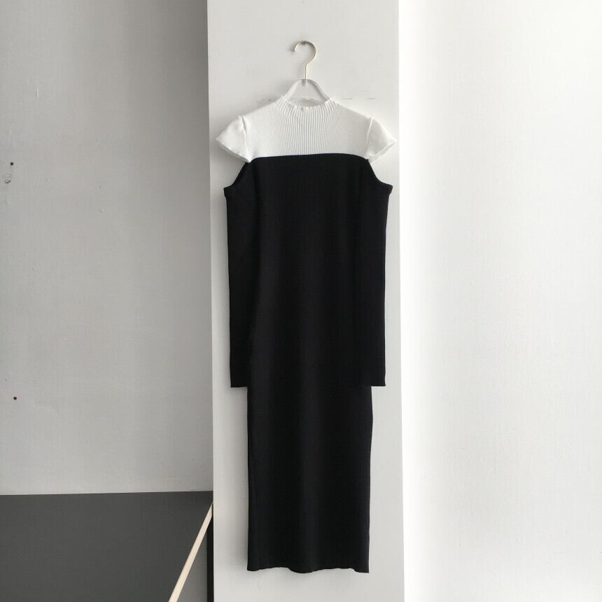 スタイル女性気質スリムカラーマッチングリーキーショルダー長袖ニットセータードレス ロング
