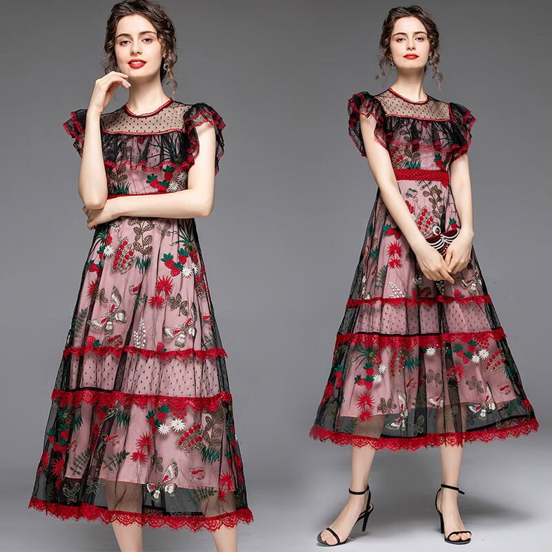 滑走路サマーホリデーロングドレス高級女性フリルメッシュパッチワークレース刺繡パーティードレスヴィンテージフローラルセクシーなVestidos ラッフル 刺繍 夏物 花柄 ビンテージ