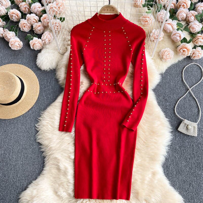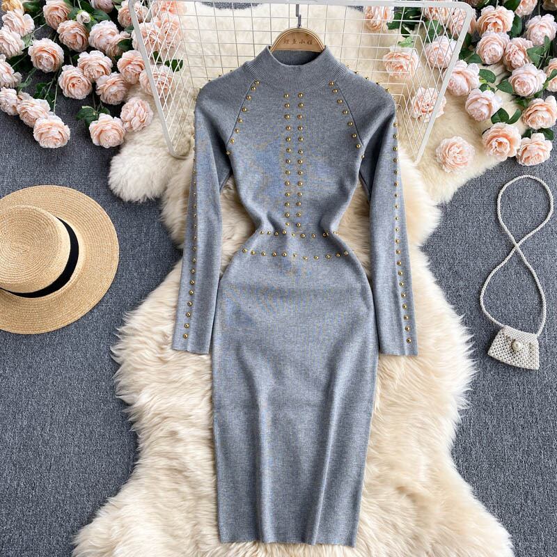 女性リベットニットドレスストランドカラー長袖伸縮性スリムシースドレス秋のセクシーなボディコンショートドレス ロング エラスティック オータム 秋物