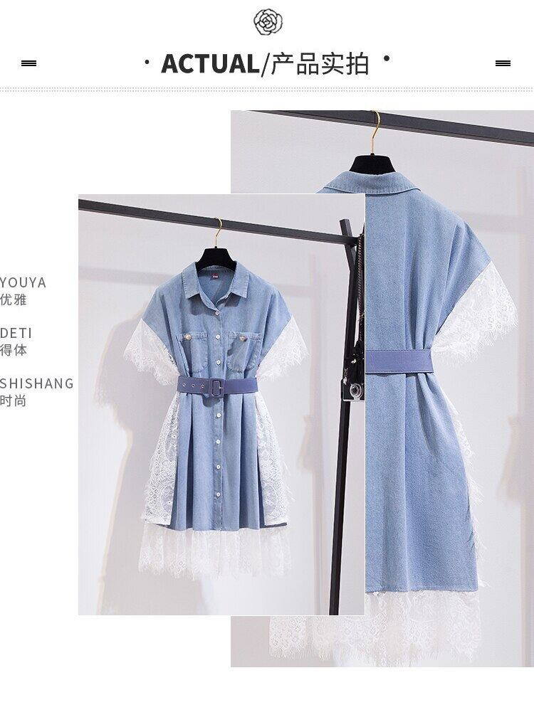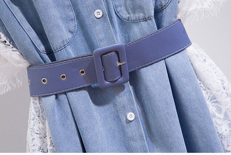 レースパッチワークレディースドレスラペルカラーウエストバンデージ膝丈デニムドレス2021夏 サマー 夏物