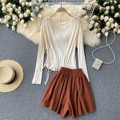 女性サマーセット長袖Oネックソリッドドローストリングトップス+ウエストワイドレッグショーツツーピーススーツ ロング 夏物 ブルマー ワイドパンツ ソリッドカラー