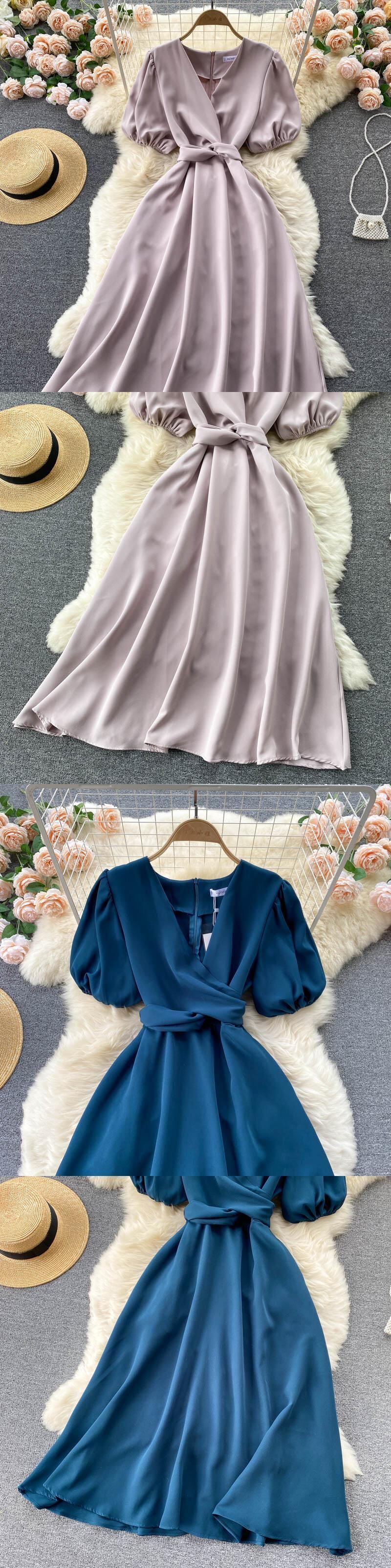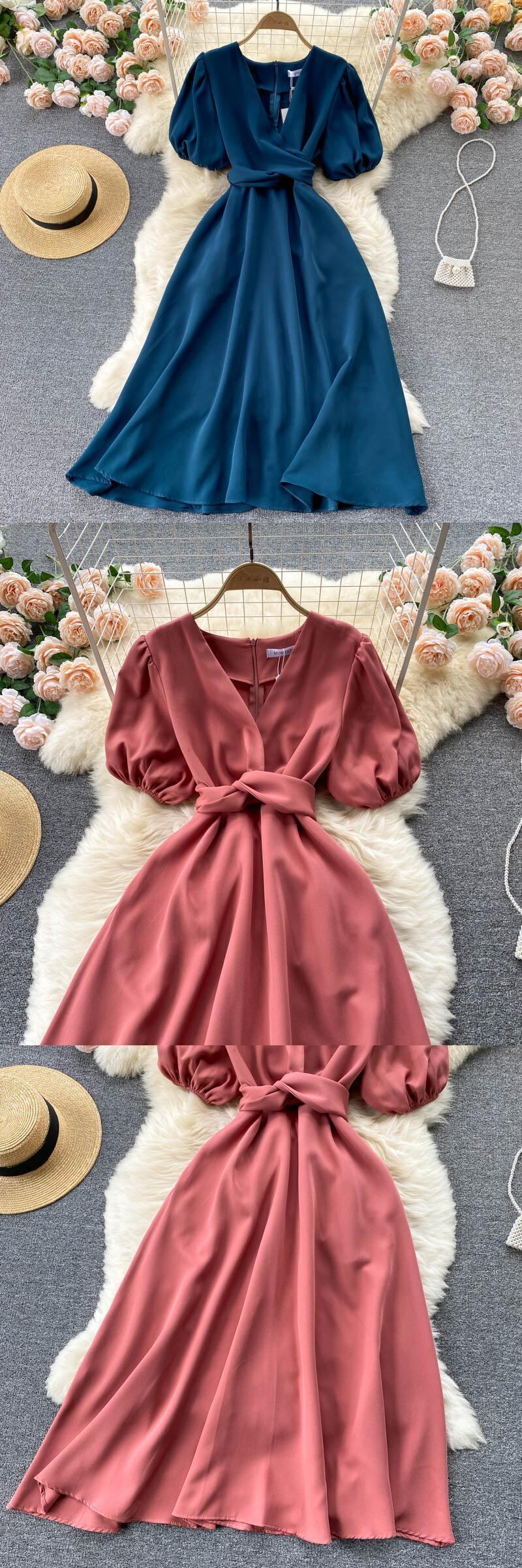 女性フレンチドレスパフスリーブVネックソリッドAラインオフィスドレスサマーストリートウェアミディサンドレス 夏物 ソリッドカラー 会社 学校 通勤や通学にも