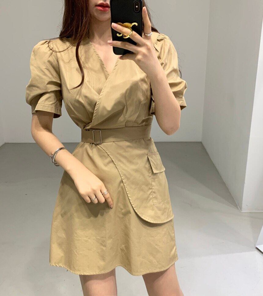 2021年女性の夏の気質のバンジドレスVネックウエストフェイクツーピースパフスリーブレースアップヴィンテージミニドレス サマー 夏物 ビンテージ