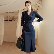 秋冬ドレスレディースオフィスマルウェアビジネスワークフィッシュテールドレス無地Vネック長袖ドレス ロング オータム 秋物 ウィンター 冬物 ソリッドカラー 会社 学校 通勤や通学にも