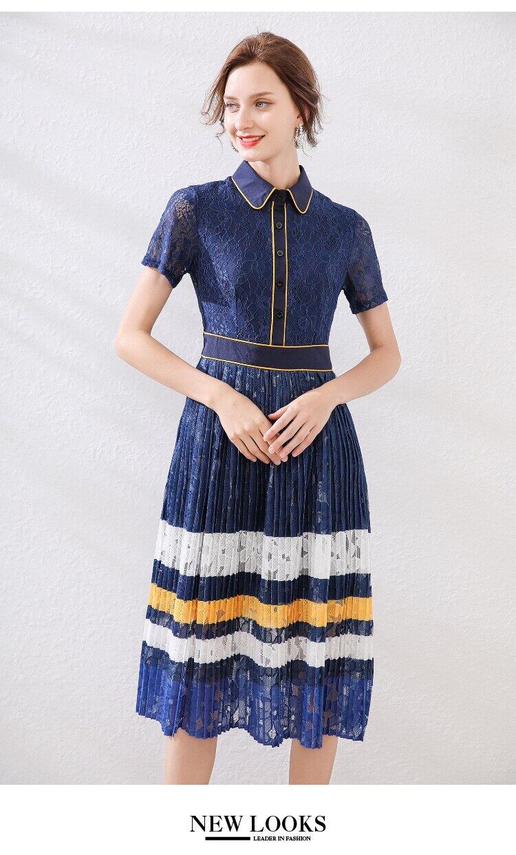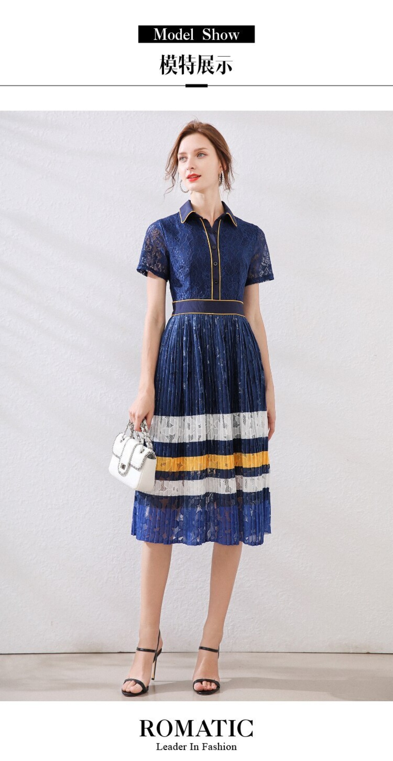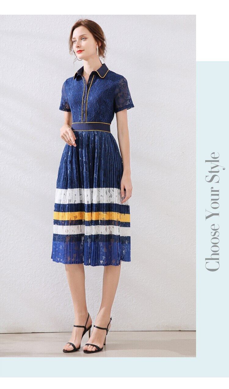 夏の女性のレースプリーツドレスストライプブルースリム半袖レースパーティードレス ショート ハーフスリーブ サマー 夏物