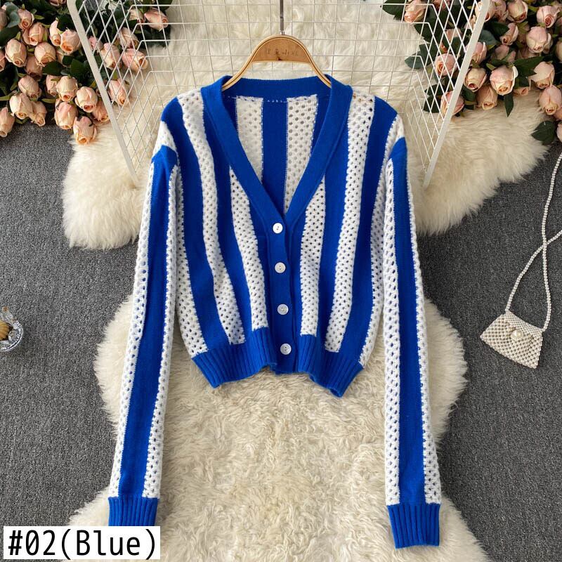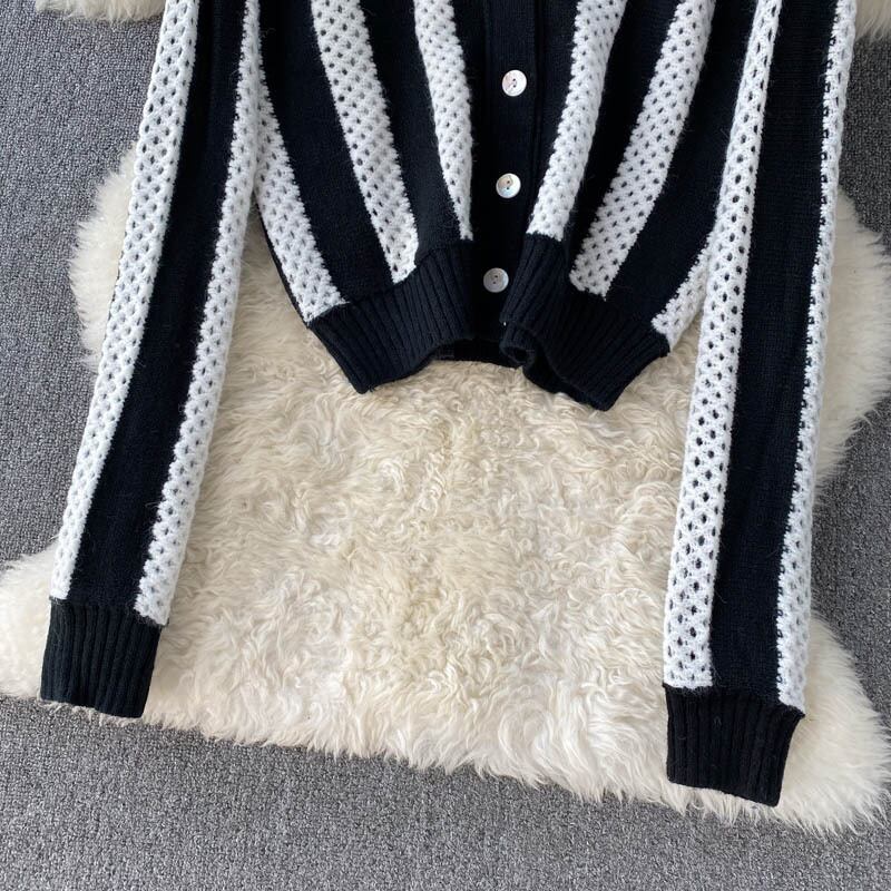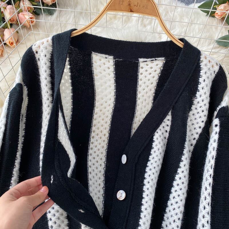 中空ニットカーディガン女性レトロ長袖ニットトップス秋冬ウォームストライプセーターアウター ロング オータム 秋物 ウィンター 冬物