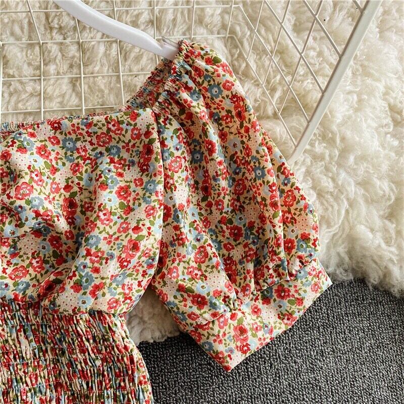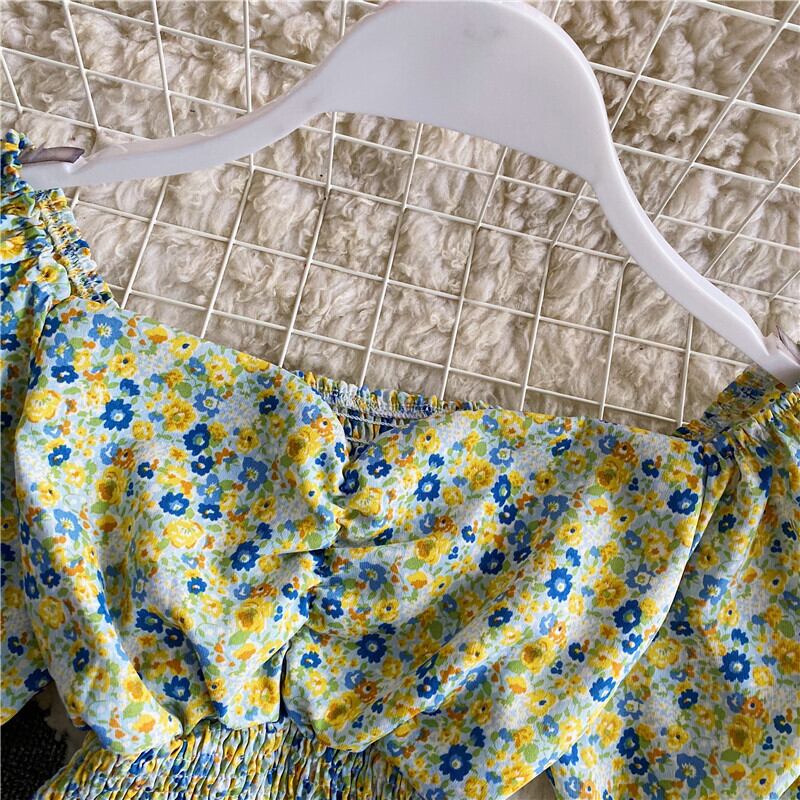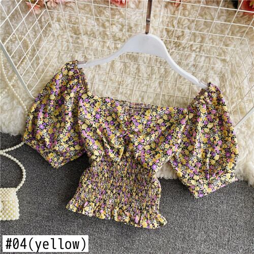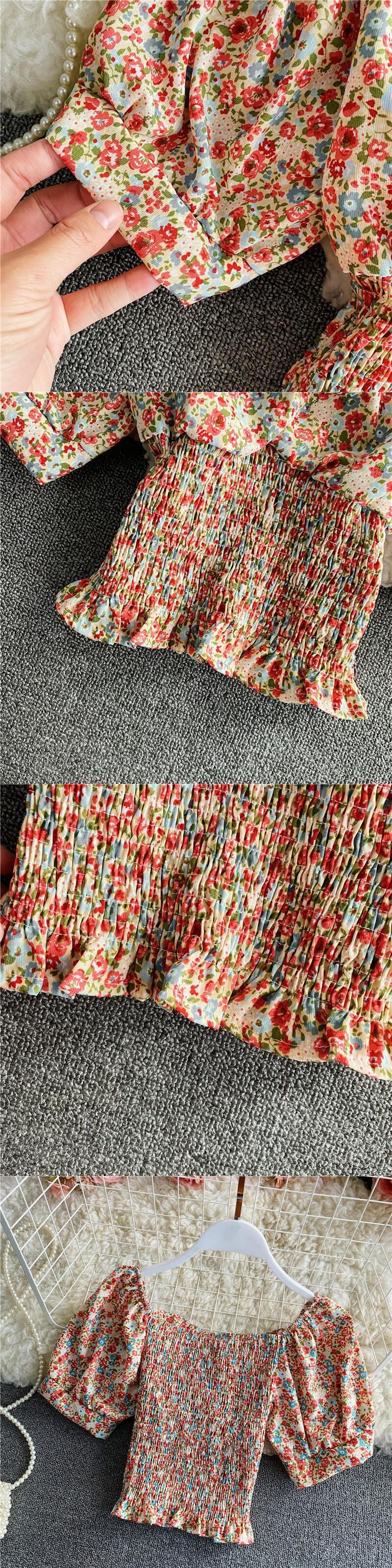 スクエアカラーパフスリーブシャツ2021ストレッチスリムウエストフローラルプリントショートシフォンブラウススウィートオールマッチブルーサ 大人ガーリー キュート カジュアル 花柄 スクウェア