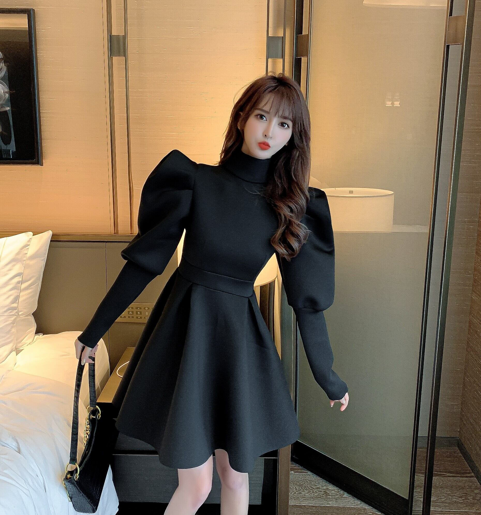 女性の色のコントラスト包帯ロングシャツドレスラペルパフスリーブルーズドレス2021年秋ストリートウェア オータム 秋物
