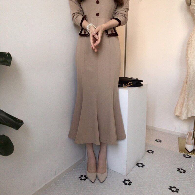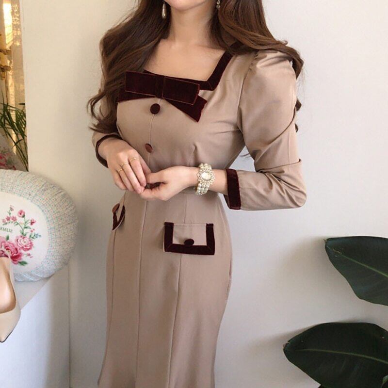 ドレス 女性 オフィスレディー ミディアム ドレスシックなスクエアカラー長袖セクシーパーティー マーメイド ドレス 秋 ロング オータム 秋物 スクウェア 会社 学校 通勤や通学にも