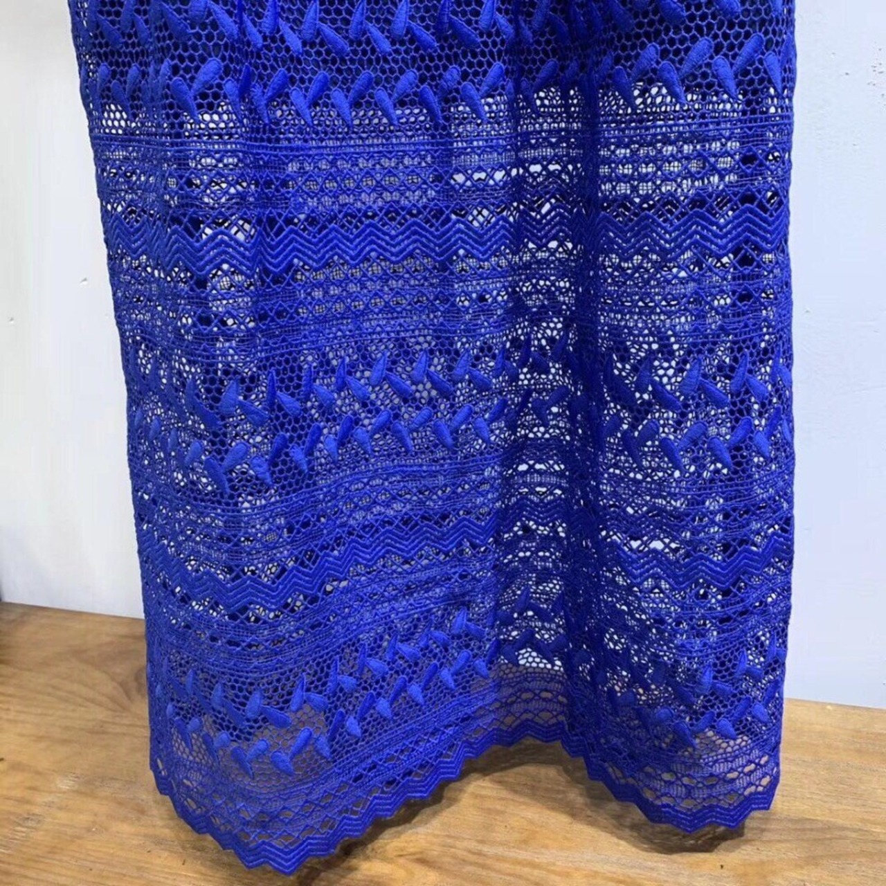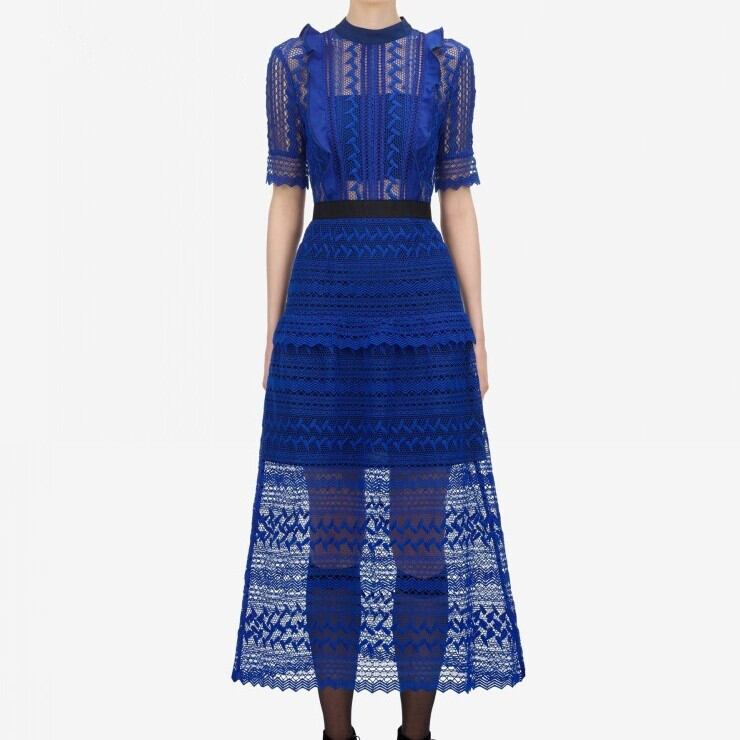 女性ブルーレースホローアウトパッチワークパーティーロングドレスest春のデザイナー女性半袖滑走路ドレス ショート ハーフスリーブ スプリング 春物