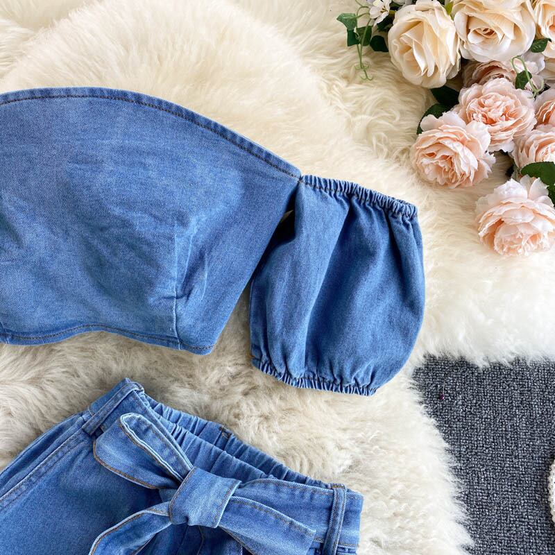 女性サマーデニムセットセクシースラッシュネック半袖シャーリングトップス+ウエストワイドレッグパンツツーピーススーツ ショート ハーフスリーブ 夏物 ワイドパンツ