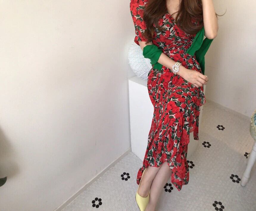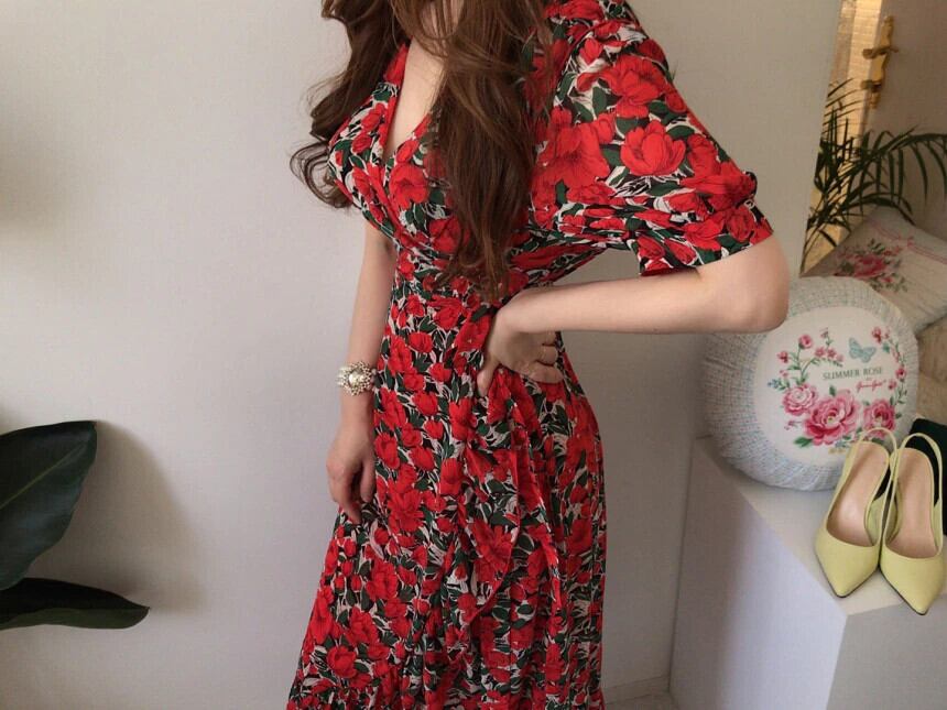 2021フラワープリントドレス女性フレンチVネックパフスリーブドレスヴィンテージスリムウエストサマーヴェスティドス 夏物 フラワーデザイン ビンテージ