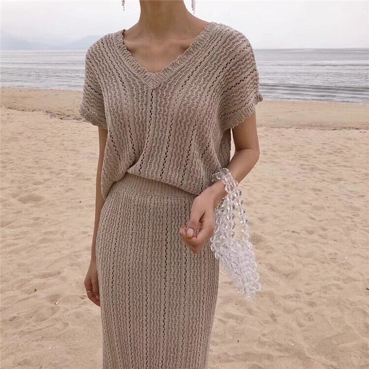 女性2021夏ニット2ピースセットVネックトップス+ラップヒップ弾性ウエストスカートセット衣装マッチングセット エラスティック 伸縮 サマー 夏物