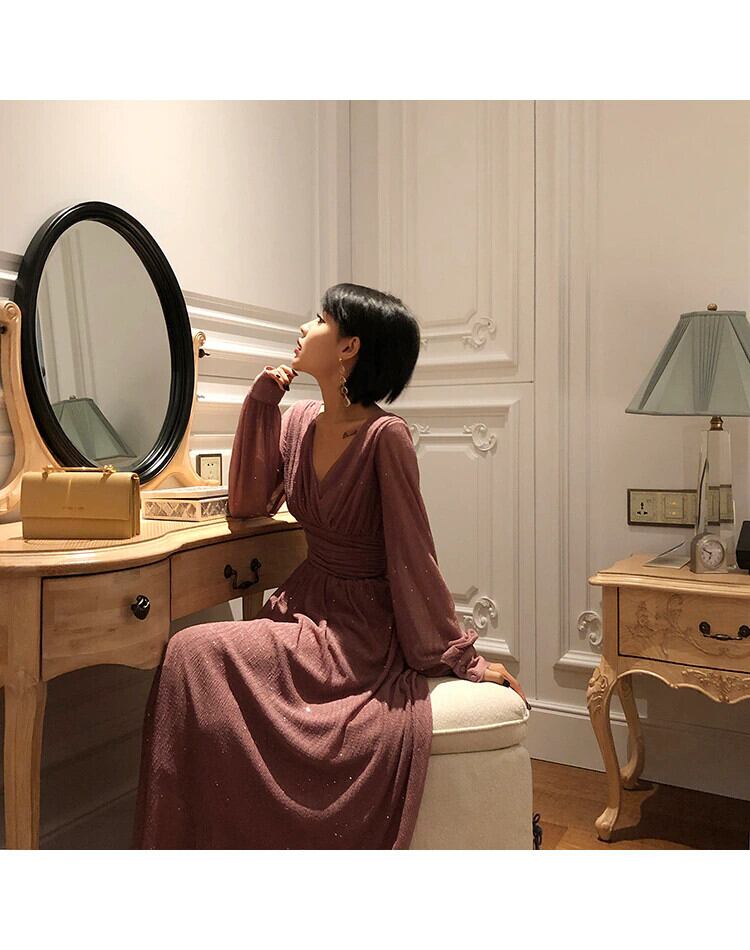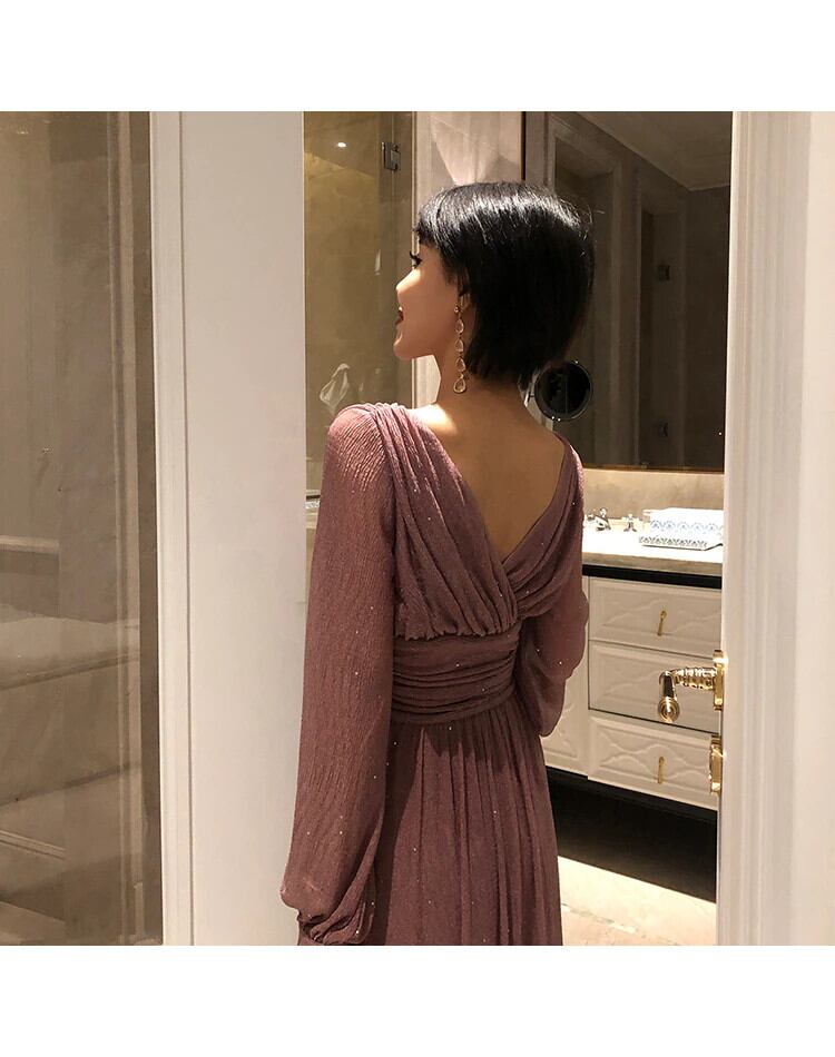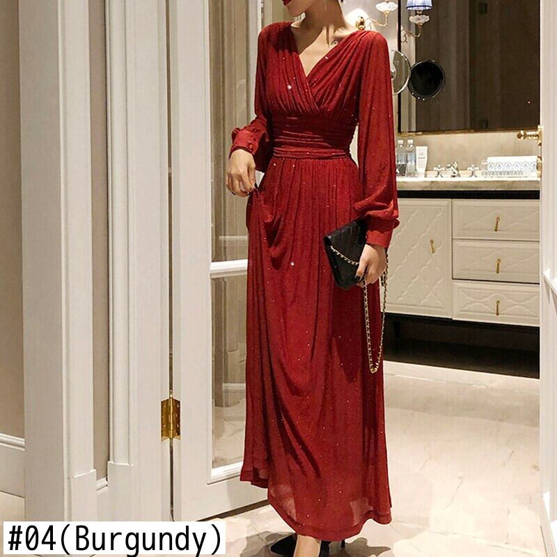 ソリッドAラインドレスプリーツパーティーヴィンテージVネックスリムウエストレディースロングドレス ソリッドカラー ビンテージ